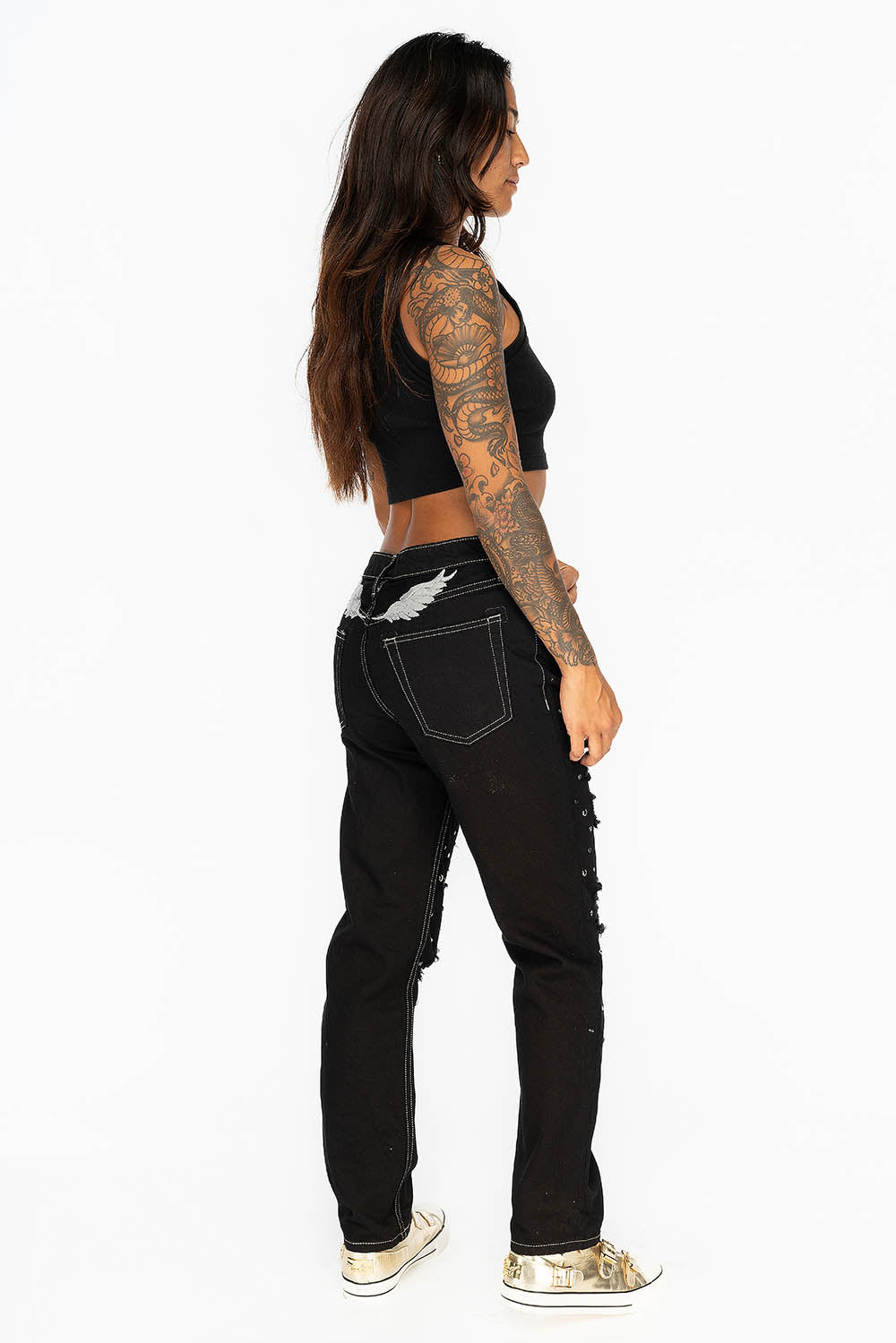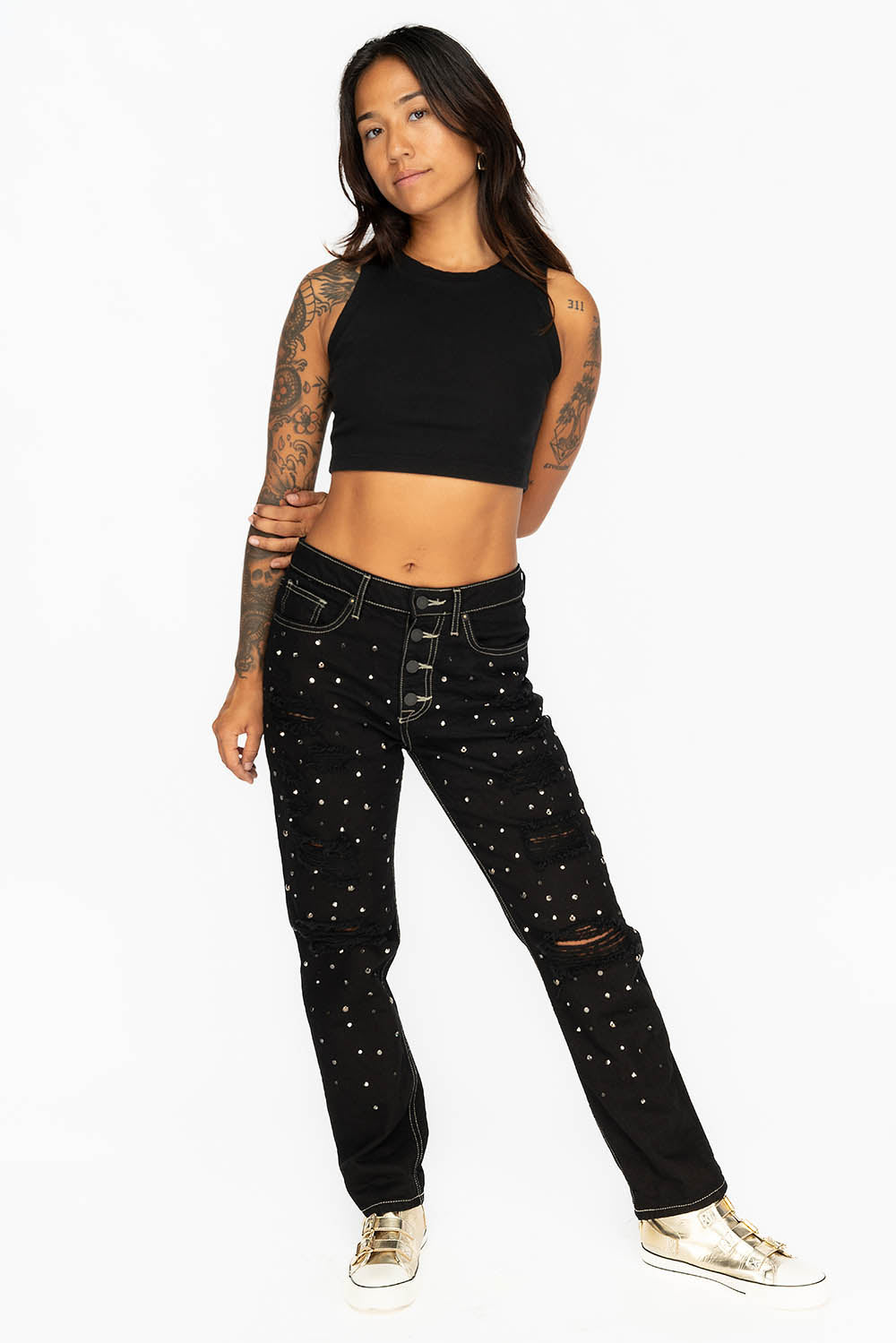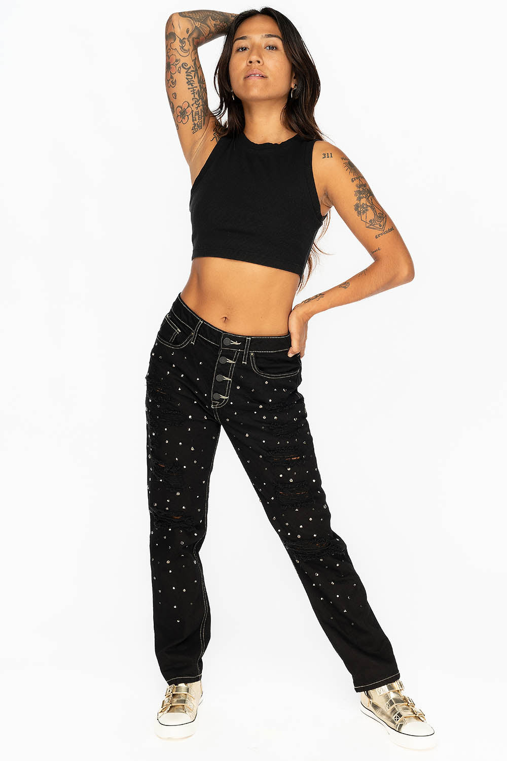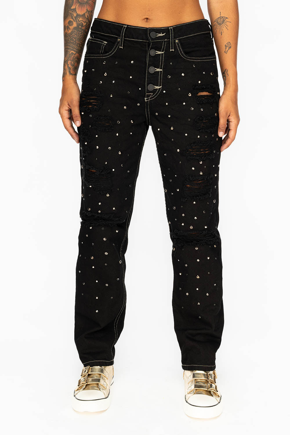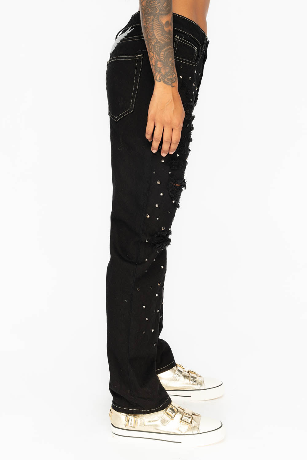 BOYFRIEND JEANS IN PURE BLACK WITH BLACK AND SILVER STUDS & CRYSTALS