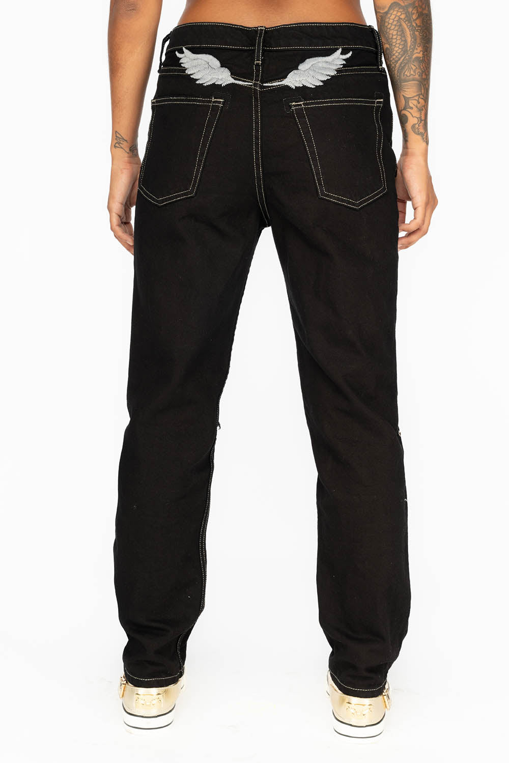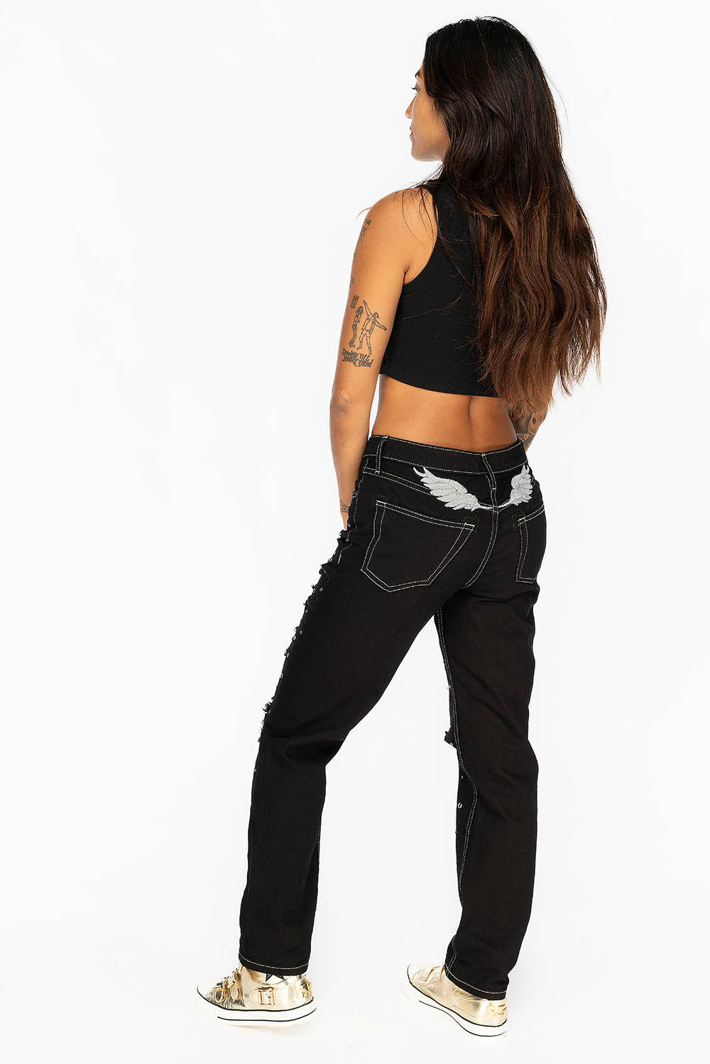 Robin's boyfriend jeans in Pure Black with black, silver studs & Crystals embellishment.