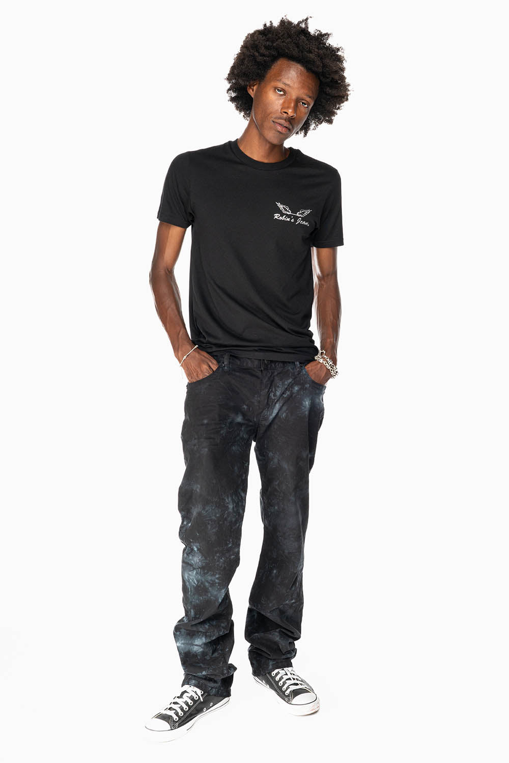 Robin's classic 5 pocket straight leg jeans in Astro Black wash embellished with Blk Diamond Crystals in the back pockets. These jeans are Robin's original 5 pocket straight leg fit, they come in a classic Astro black color with tonal embroidered wings, and are constructed using lightweight stretch poplin fabric.