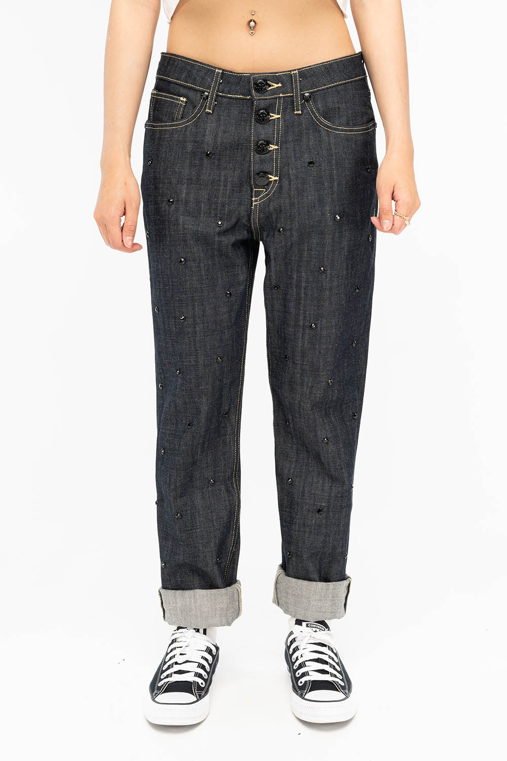 WOMENS BOYFRIEND STYLE JEANS RELAXED FIT WITH JET BLACK CRYSTALS IN RAW