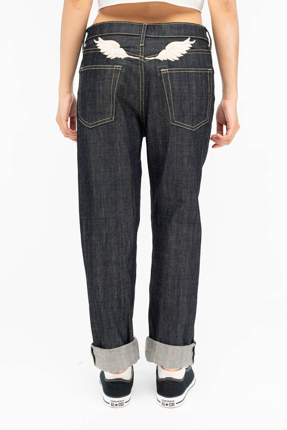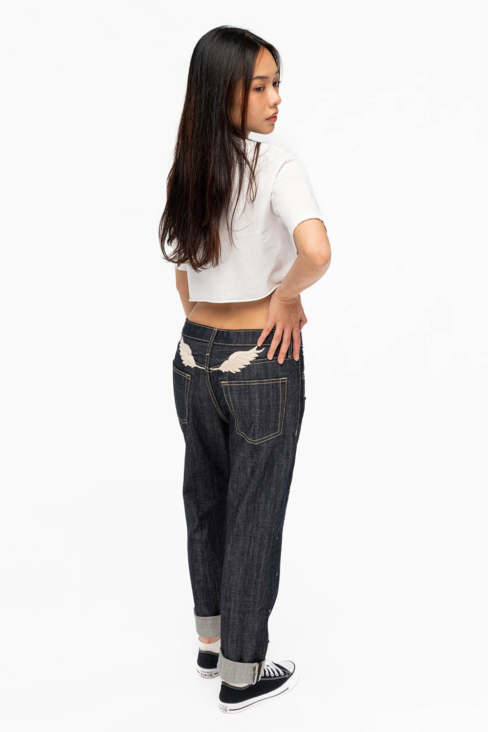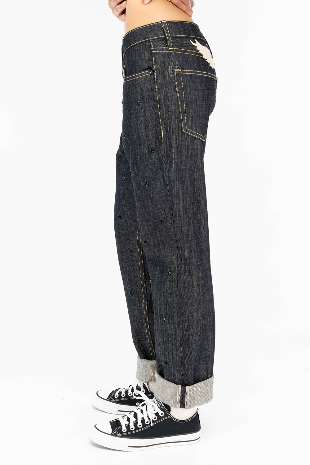 Premium Raw Denim of Boyfriend Style Relaxed Fit w/ Natural Color Wing Embroidery across Yoke in Custom Black Buttons & Black Rims Studded Big Jet Black Crystals
