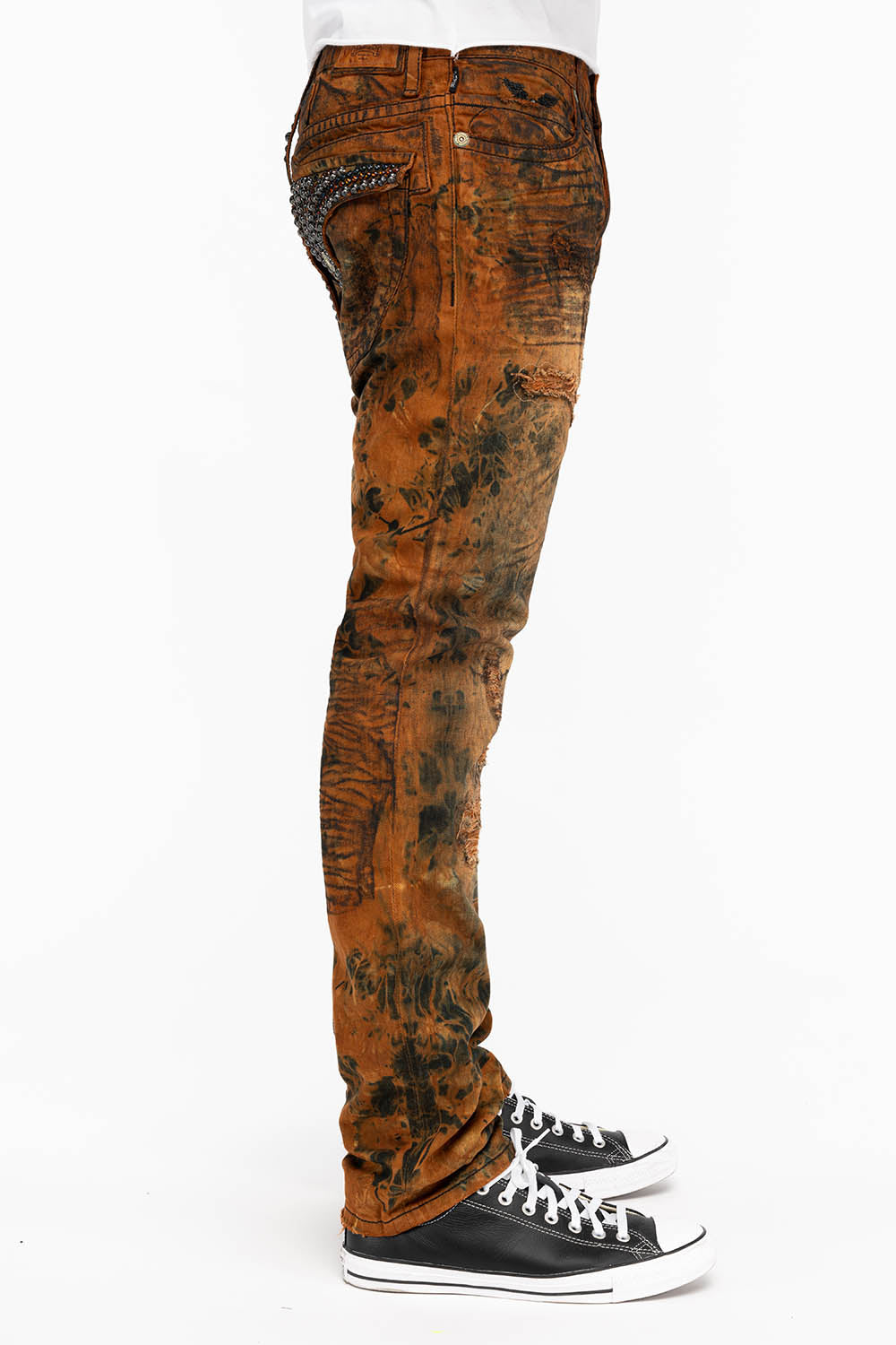 MENS LONG FLAP SLIM JEANS WITH STUDS AND CRYSTALS IN LOS ANGELES WASH
