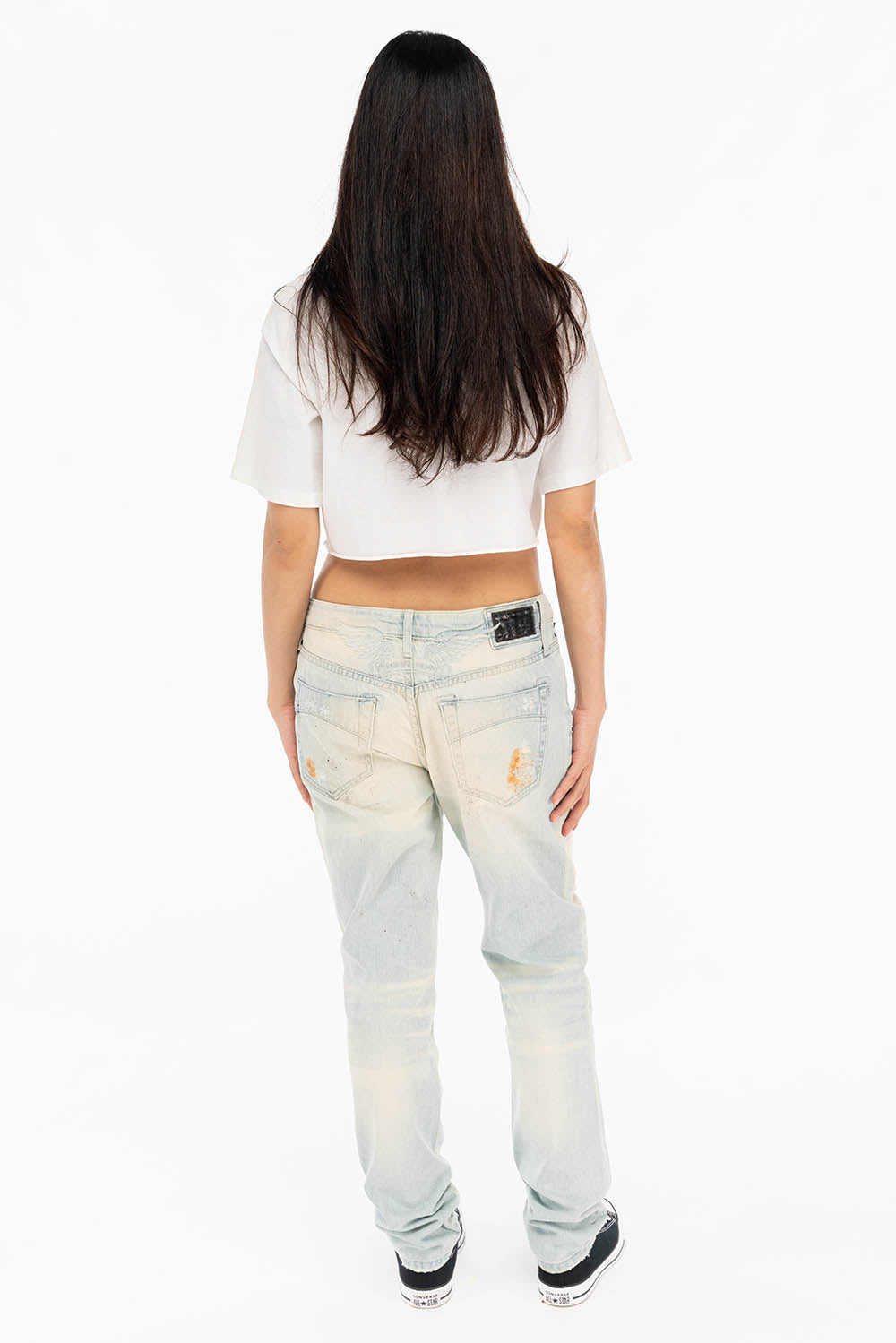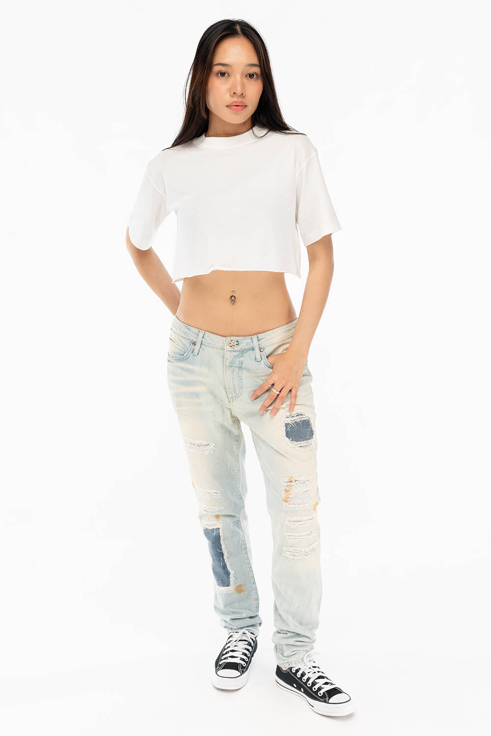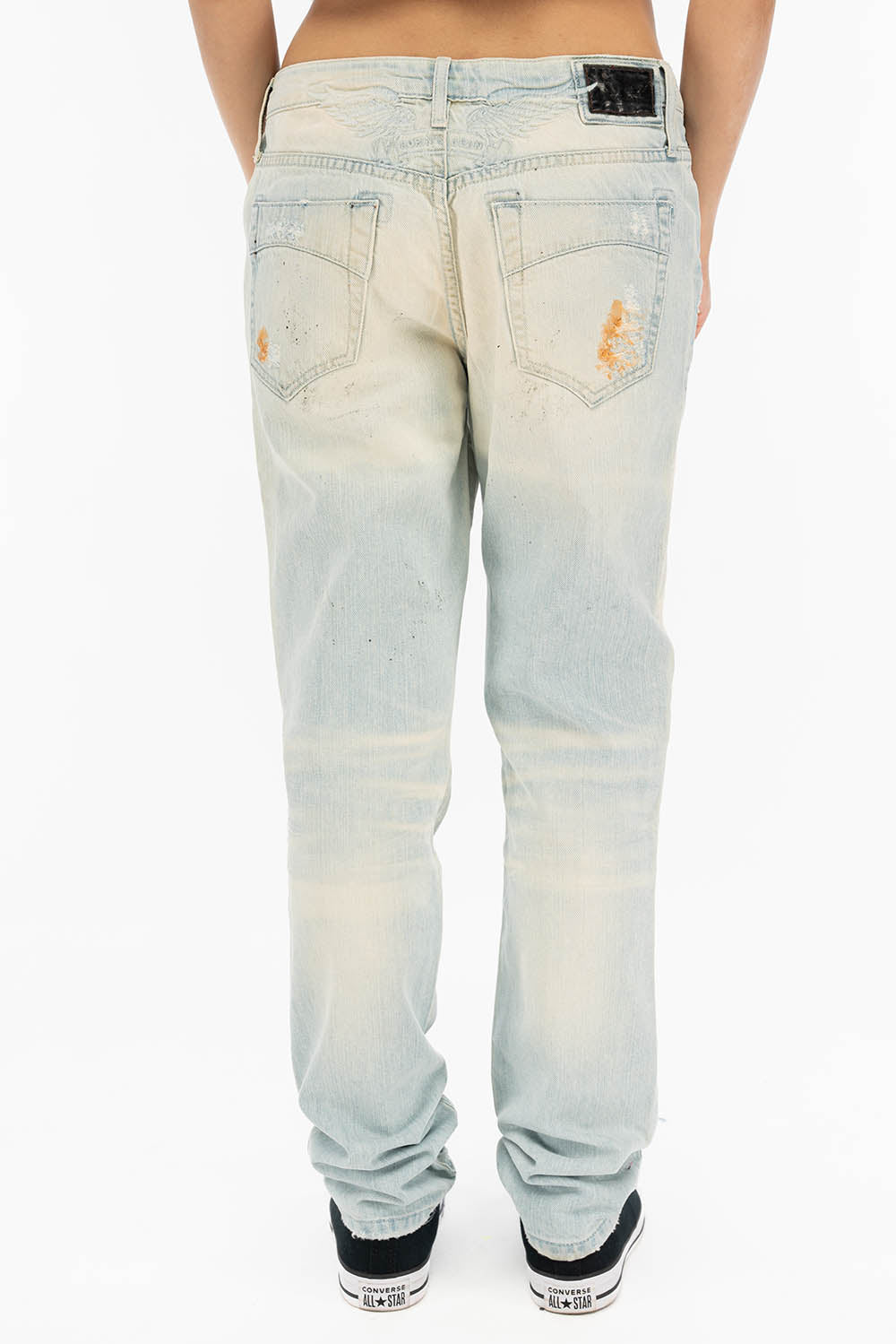 Robin's boyfriend inspired jeans in George specialty wash. This jean comes with tonal embroidered logo on the yoke and made of high quality premium denim and features indigo blue wash insert patches on the front.