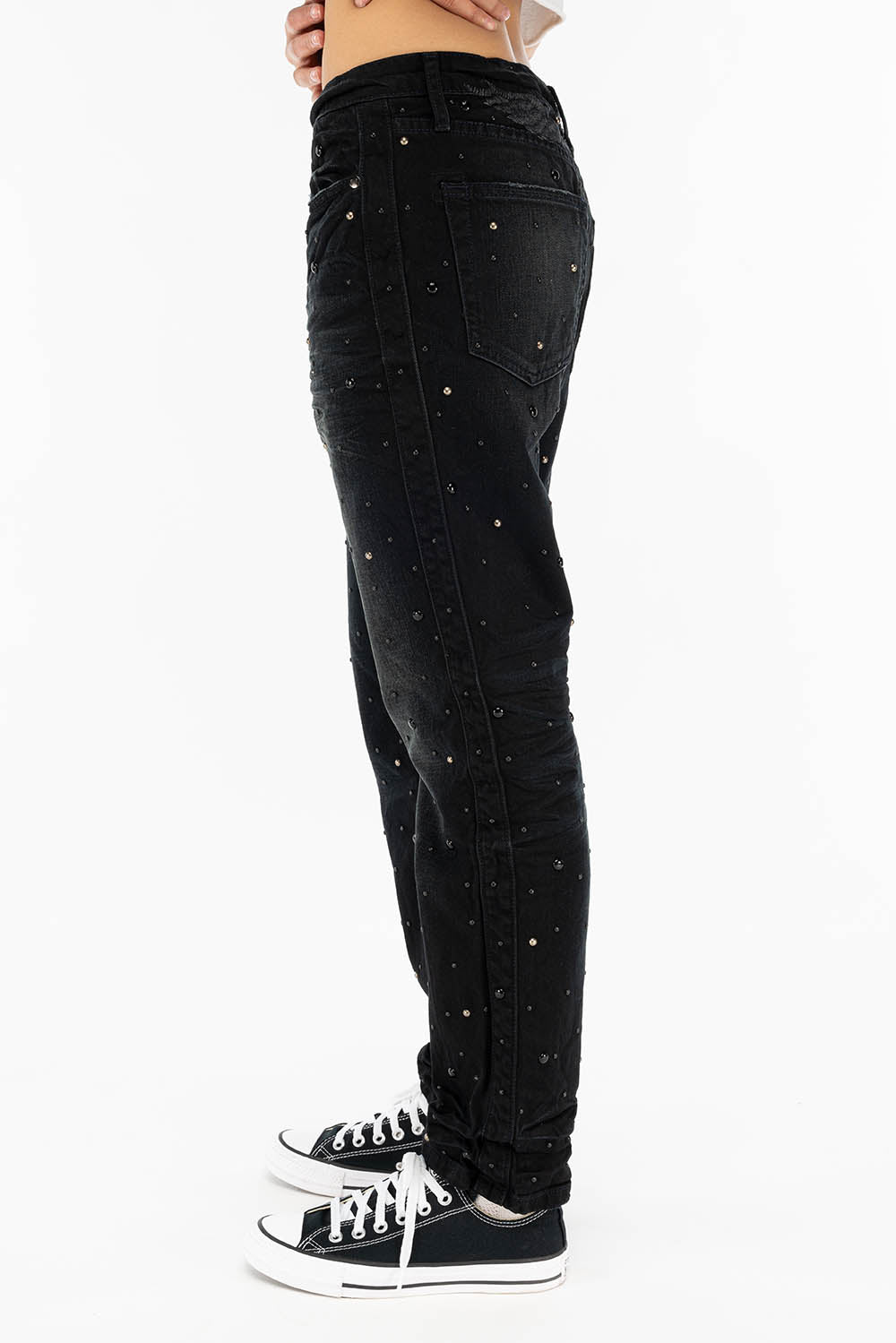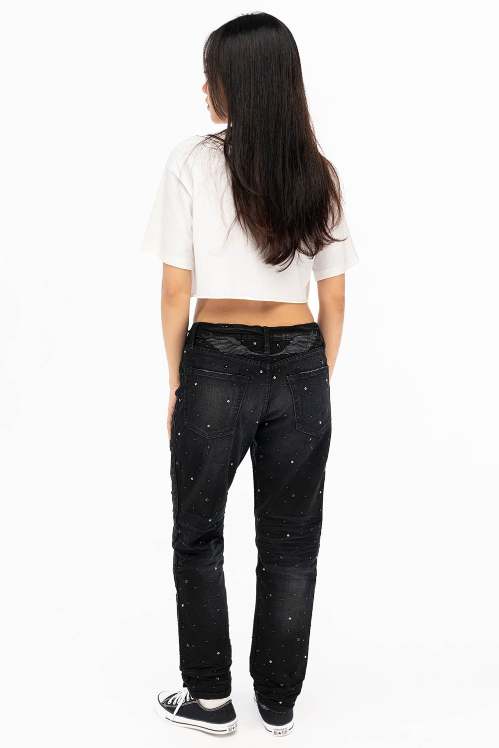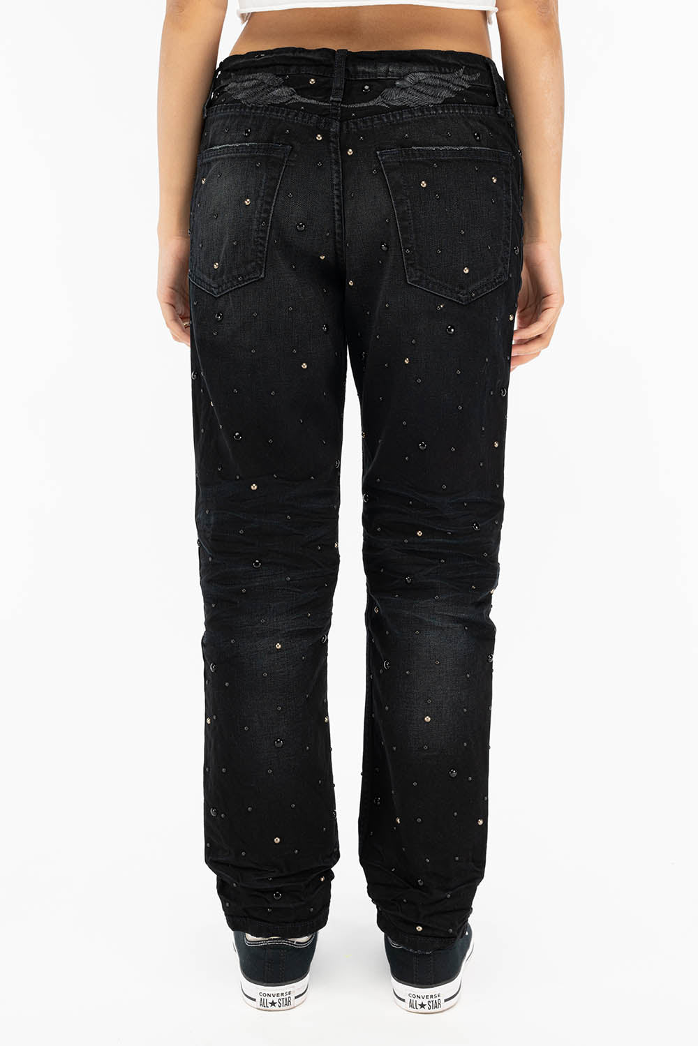 BOYFRIEND JEANS IN F_ED UP BLACK BROKEN WASH WITH BLACK AND SILVER STUDS