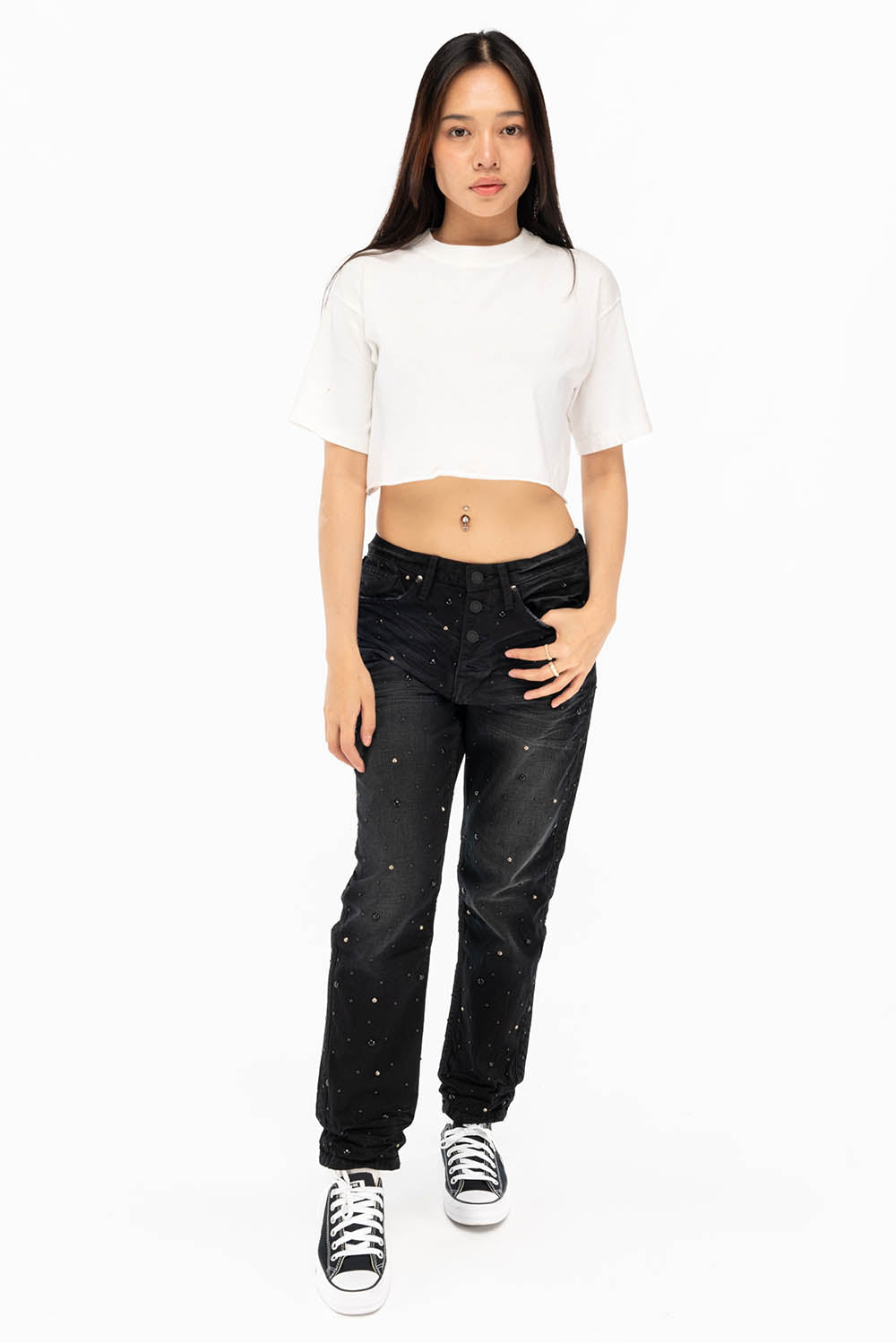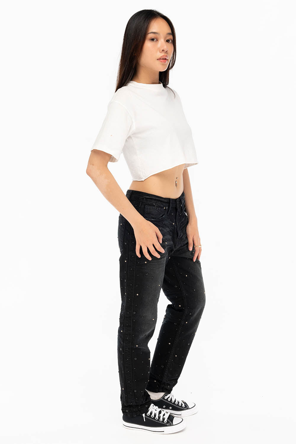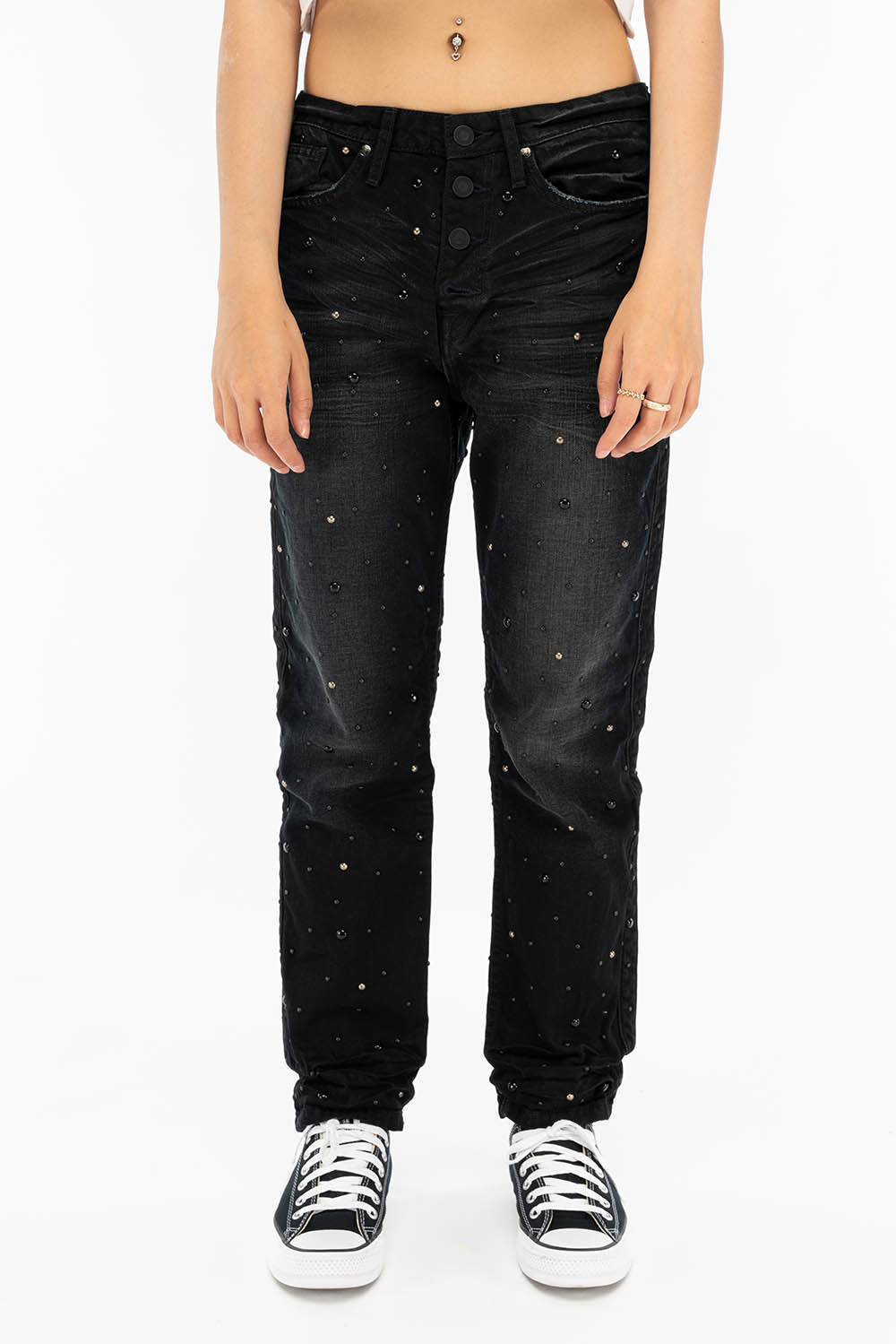 BOYFRIEND JEANS IN F_ED UP BLACK BROKEN WASH WITH BLACK AND SILVER STUDS