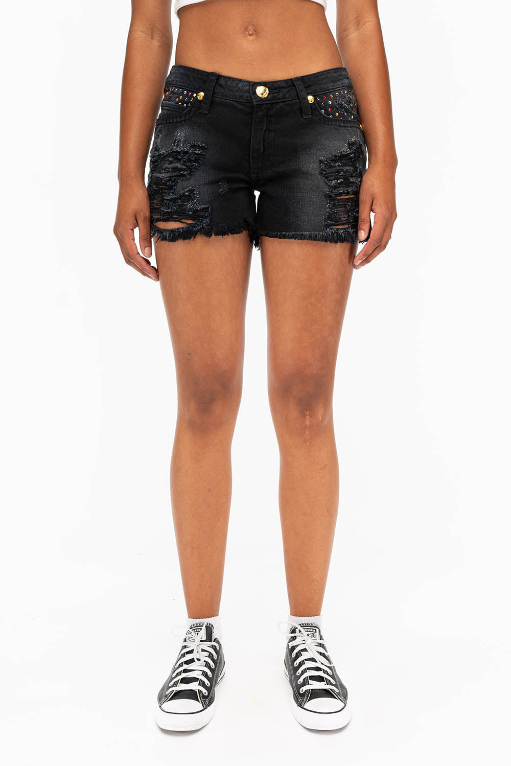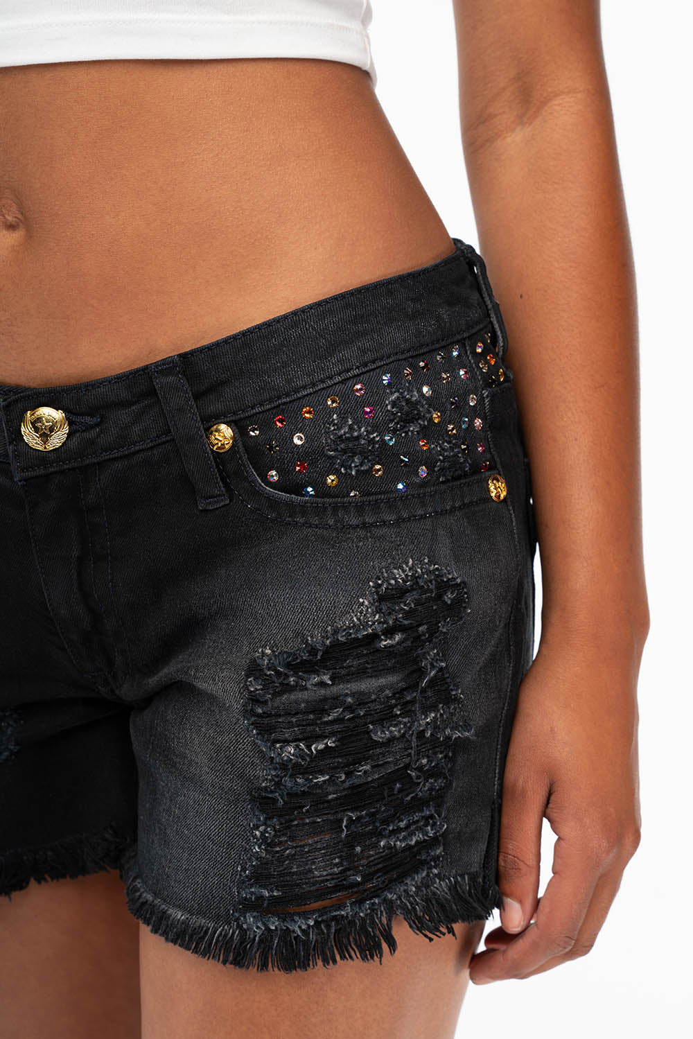 DESTROYED DENIM SHORTS WITH MULITCOLR CRYSTALS IN BLACK