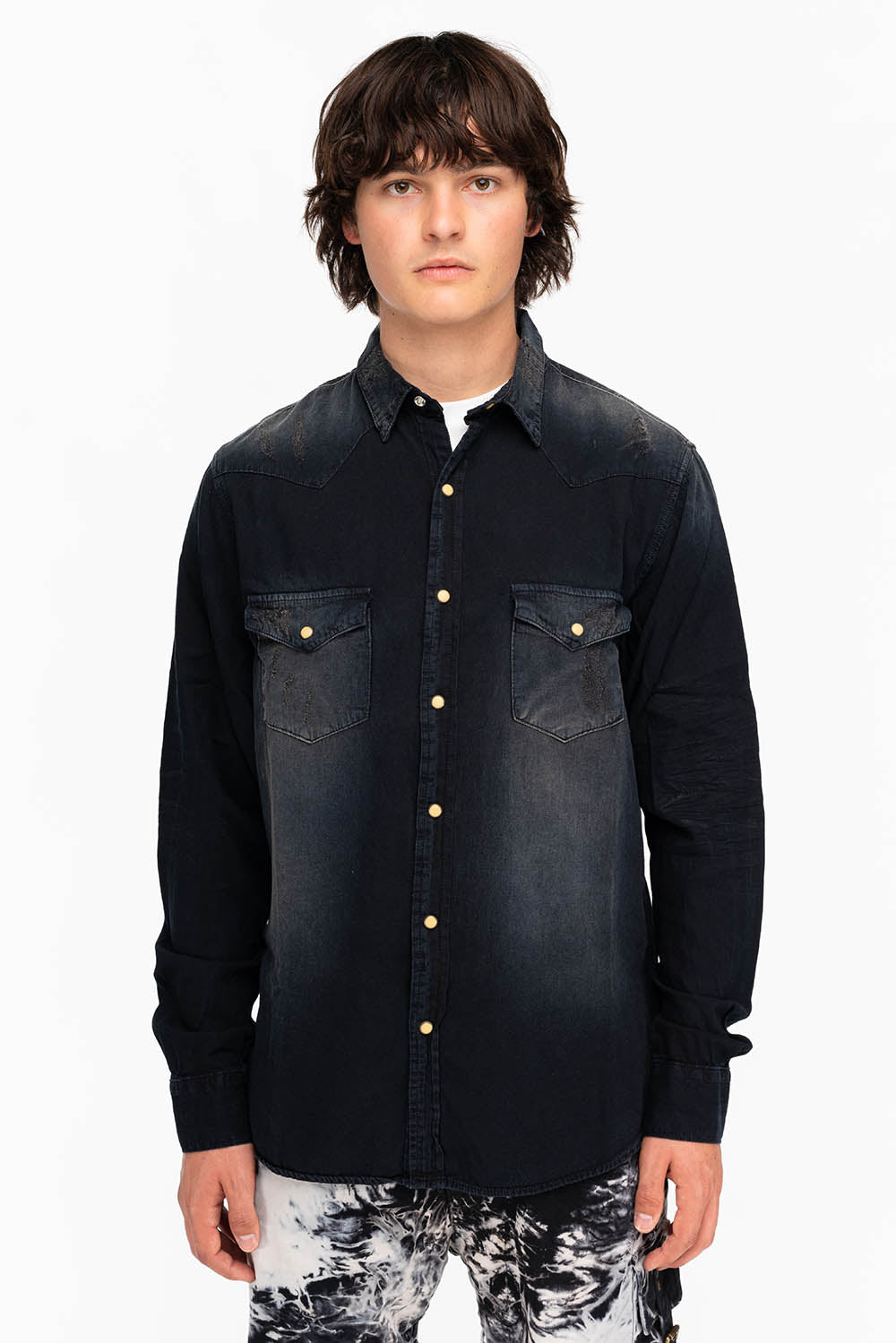 WESTERN NATIVE AMERICAN STYLE MENS DESTROY DENIM SHIRT IN F_ED UP BLACK