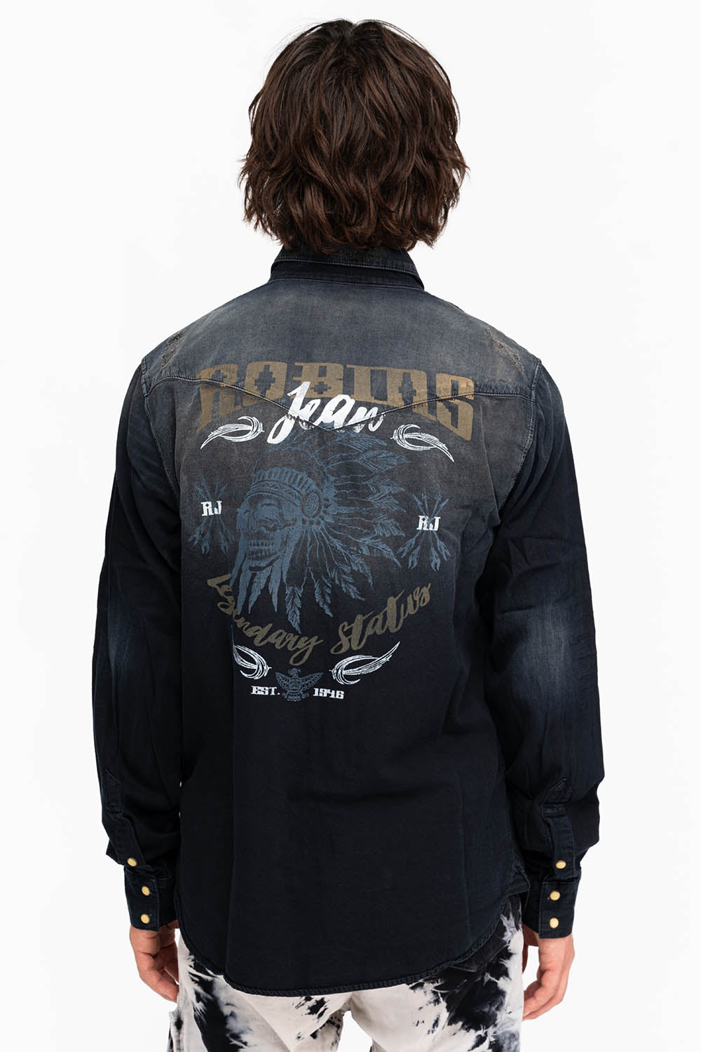 Robin's western style denim shirt in F_Up Black. This shirt features a backside print with Native American detailing. This shirt comes in a destroyed wash, and is constructed using a soft lightweight premium organic cotton for superior comfort.