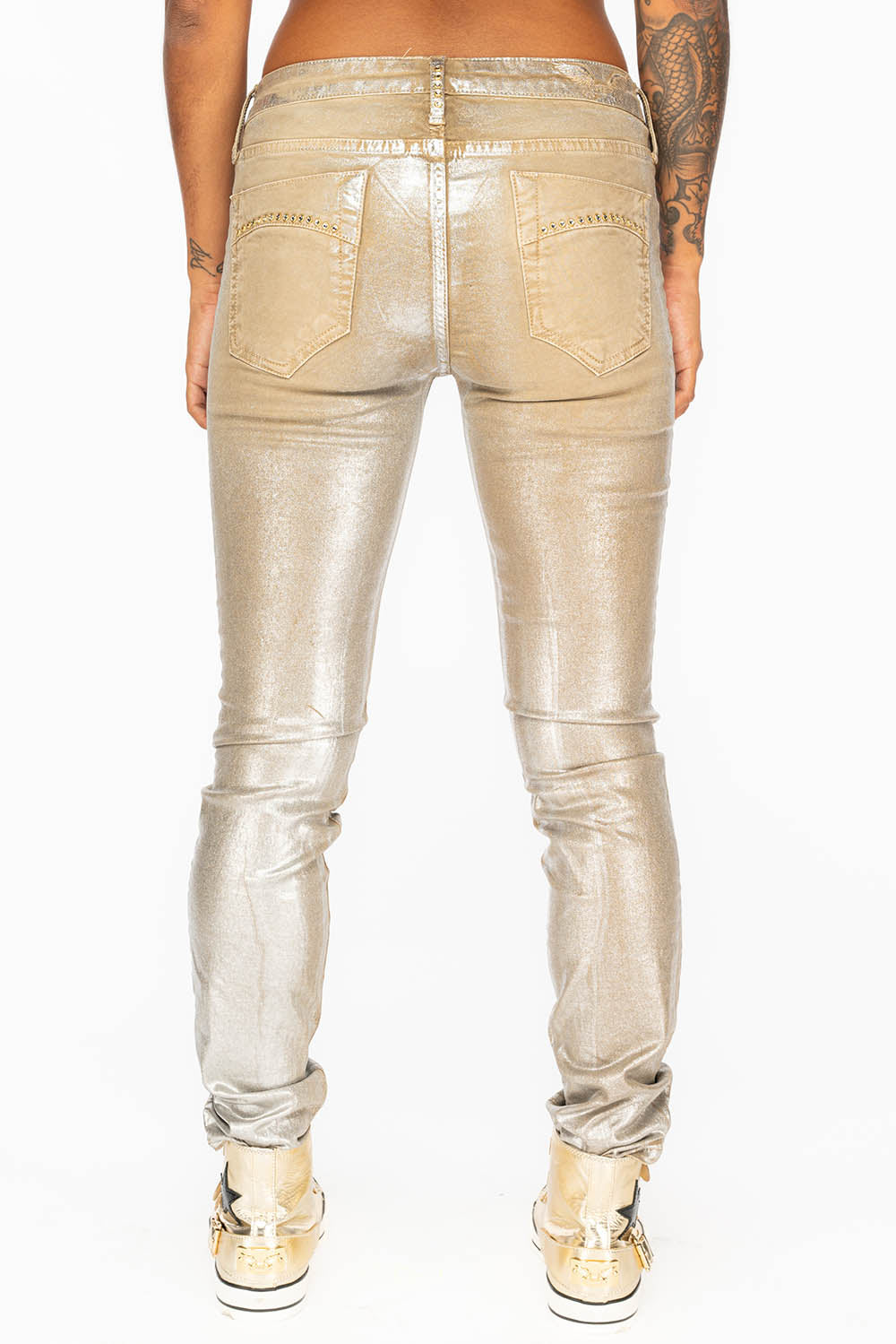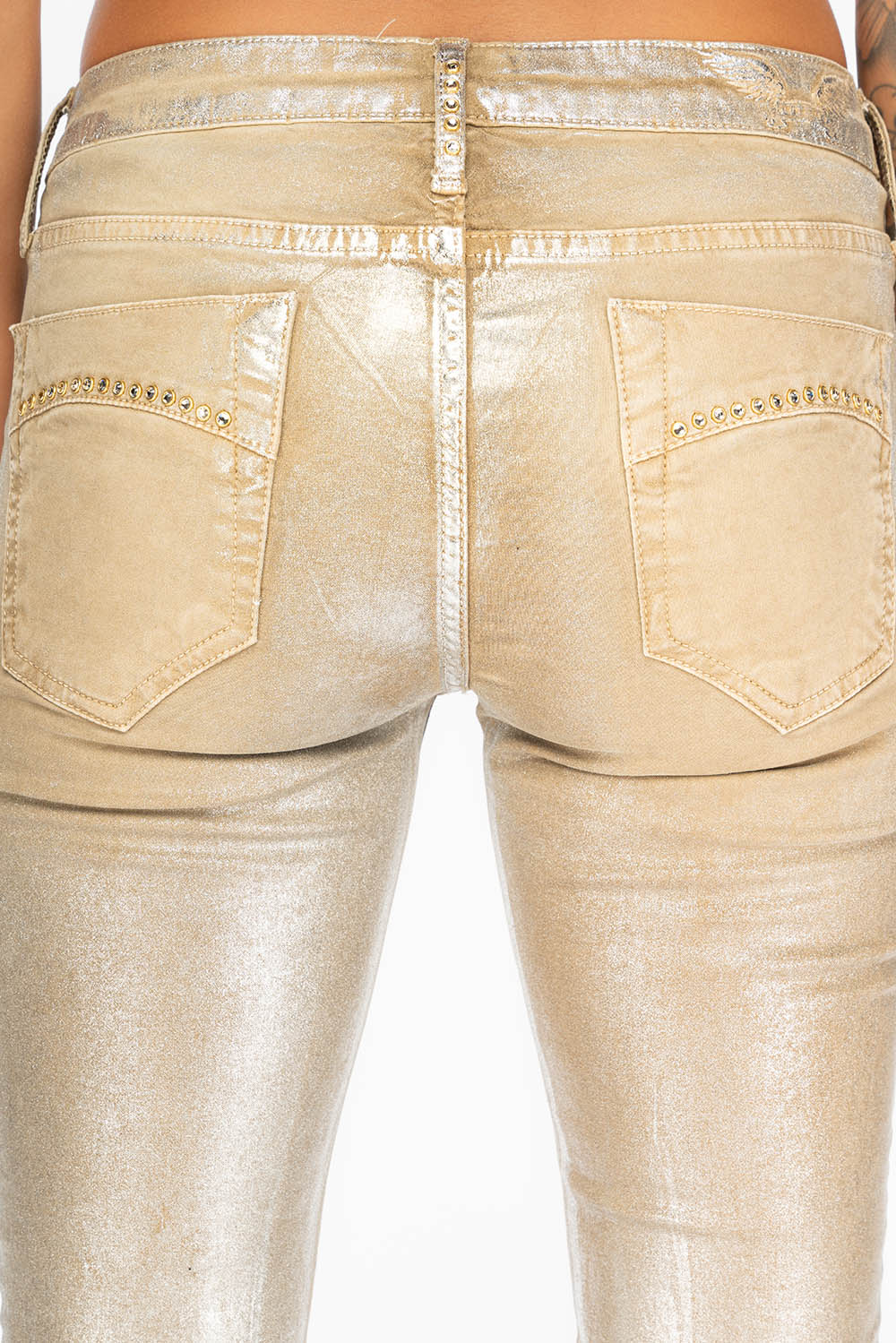 Robin's skinny Jane mid rise in Khaki Lisa Silver color Treatment & Embellished with Smoky Topaz Crystals front leg and Back Pocket. This jean is constructed using premium ultra soft stretch poplin fabric for superior comfort and style.