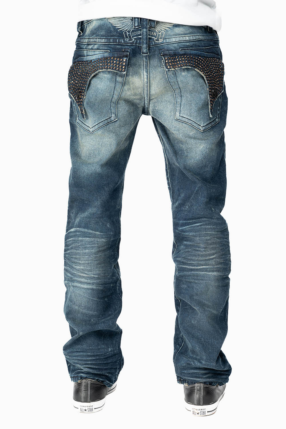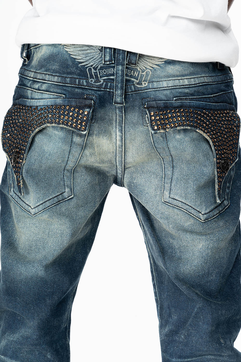 Robin's Killer Flap jeans in Blue Albany Dark wash with tonal embroidered wings with Blk buttons and fully embellished pockets with Smoky Topaz Crystals with Blk rims. These jeans are specialty soft wash in blue Albany Dark, straight fit, and constructed using premium stretch denim for both comfort and style.