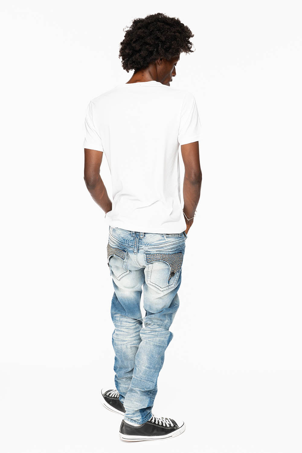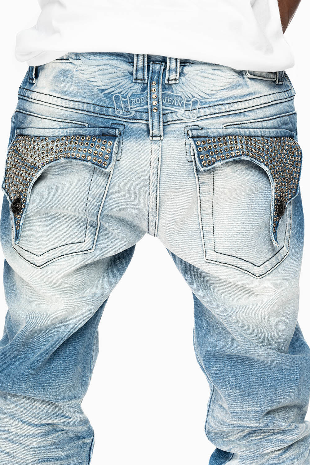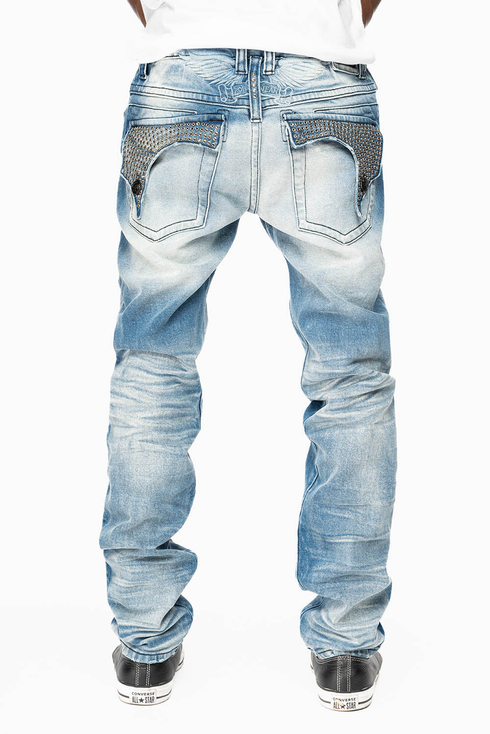 Robin's Killer Flap jeans in Blue Omaha Medium wash with tonal embroidered wings with Blk buttons and fully embellished pockets of Black Diamond Crystals. These jeans are specialty soft wash in blue Omaha Medium, skinny leg fit, and constructed using premium stretch denim for both comfort and style.