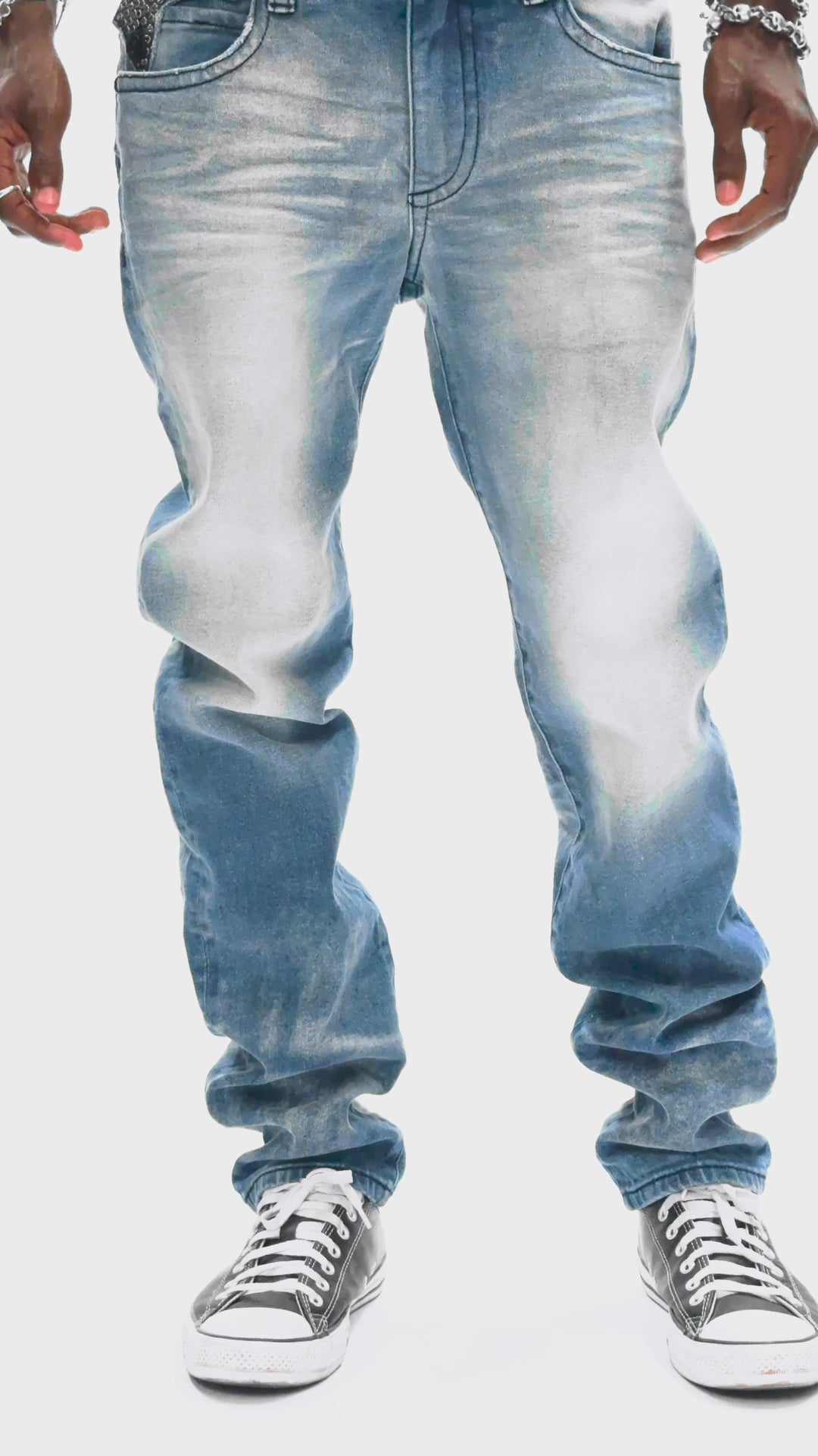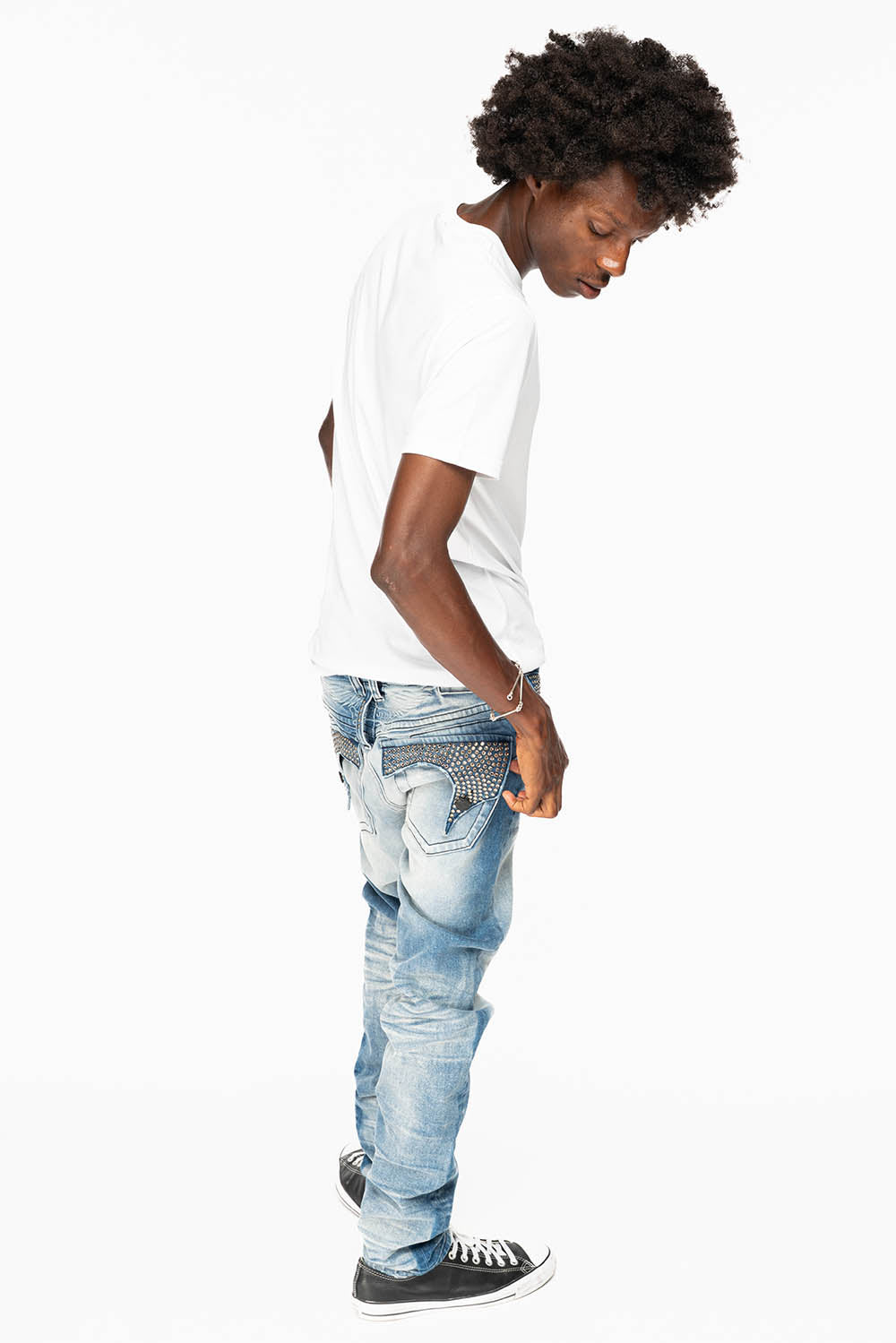 - Blue Omaha Medium wash Long Flap Jeans fully embellished with Black Diamond Crystals