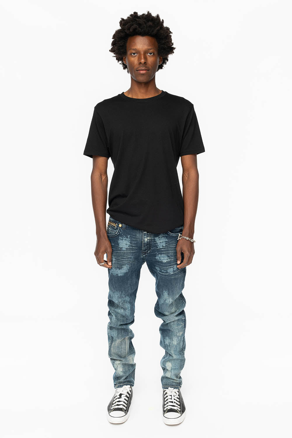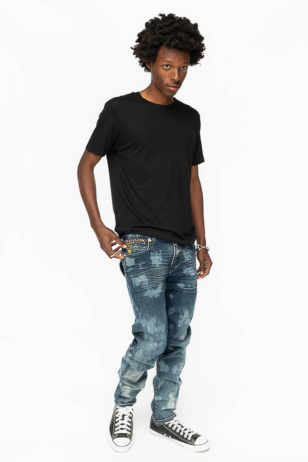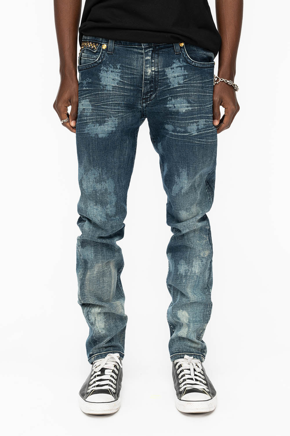 KILLER FLAP MENS SKINNY JEANS IN NEW JAPAN MEDIUM WASH WITH ANTIQUE BRASS PYRAMID STUDS AND AURUM CRYSTALS