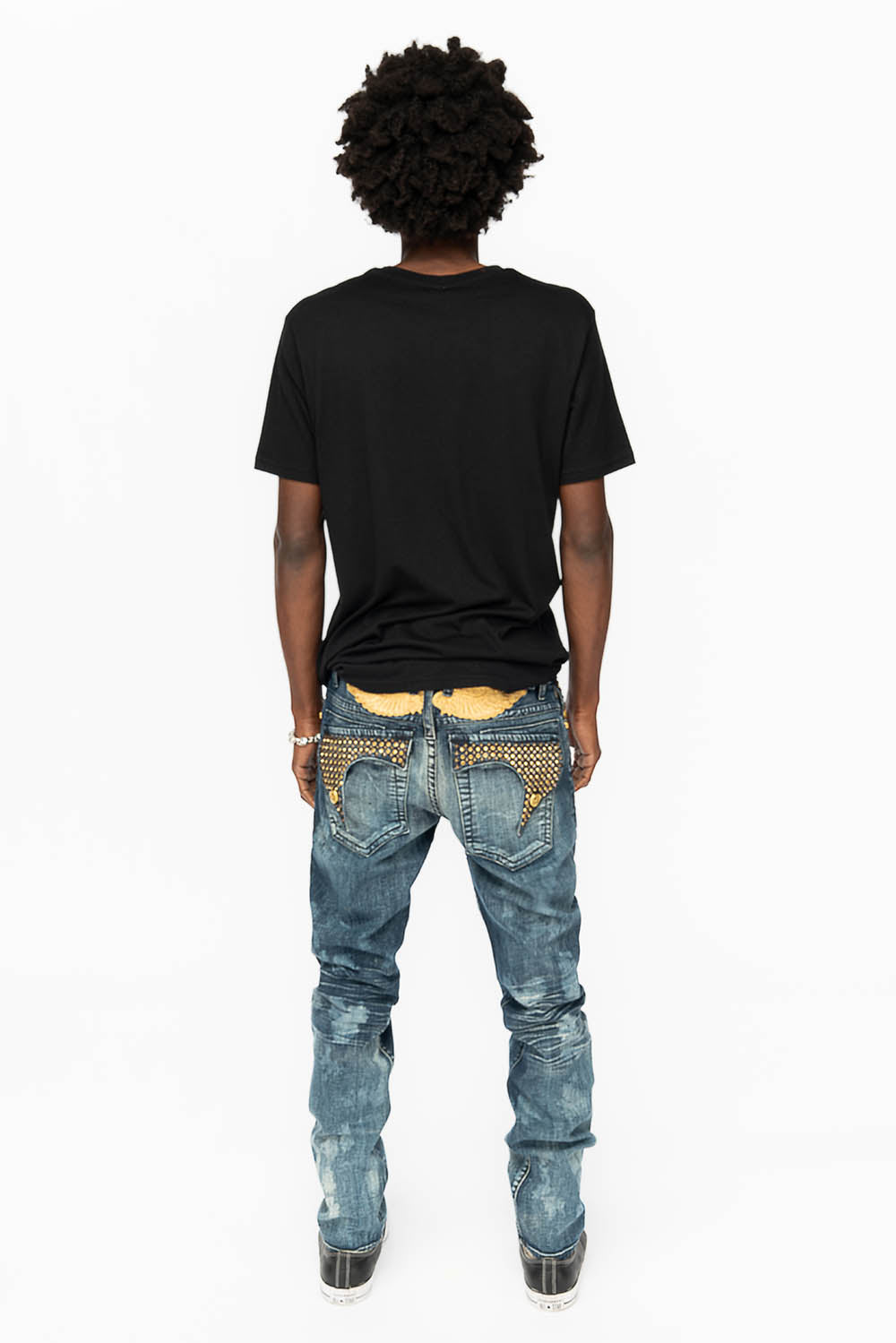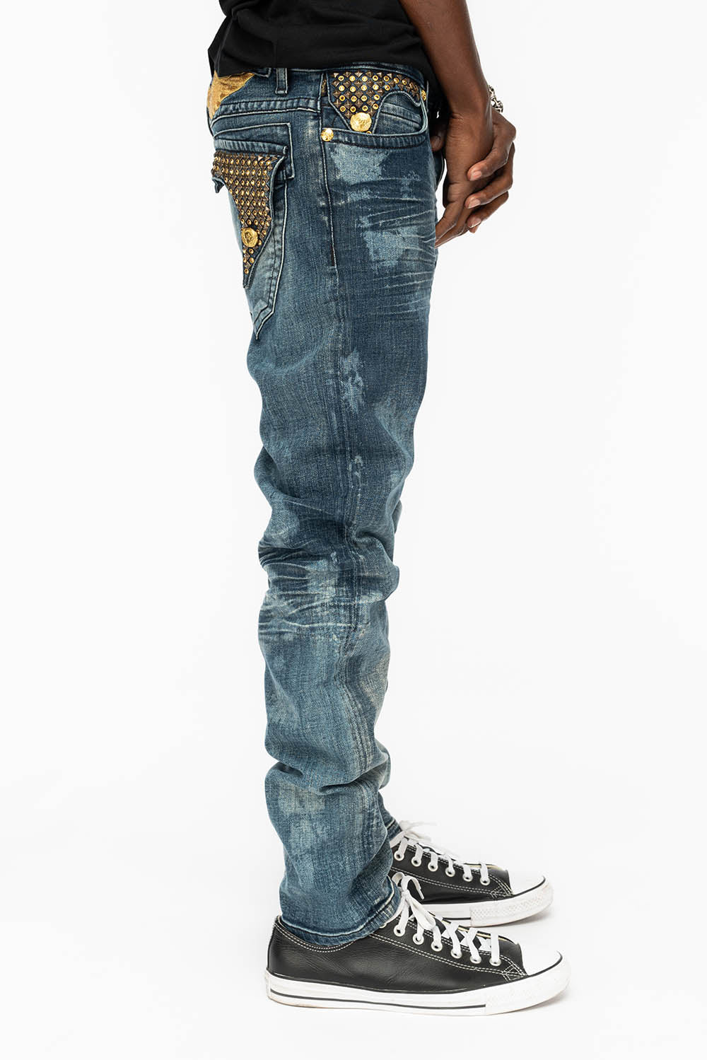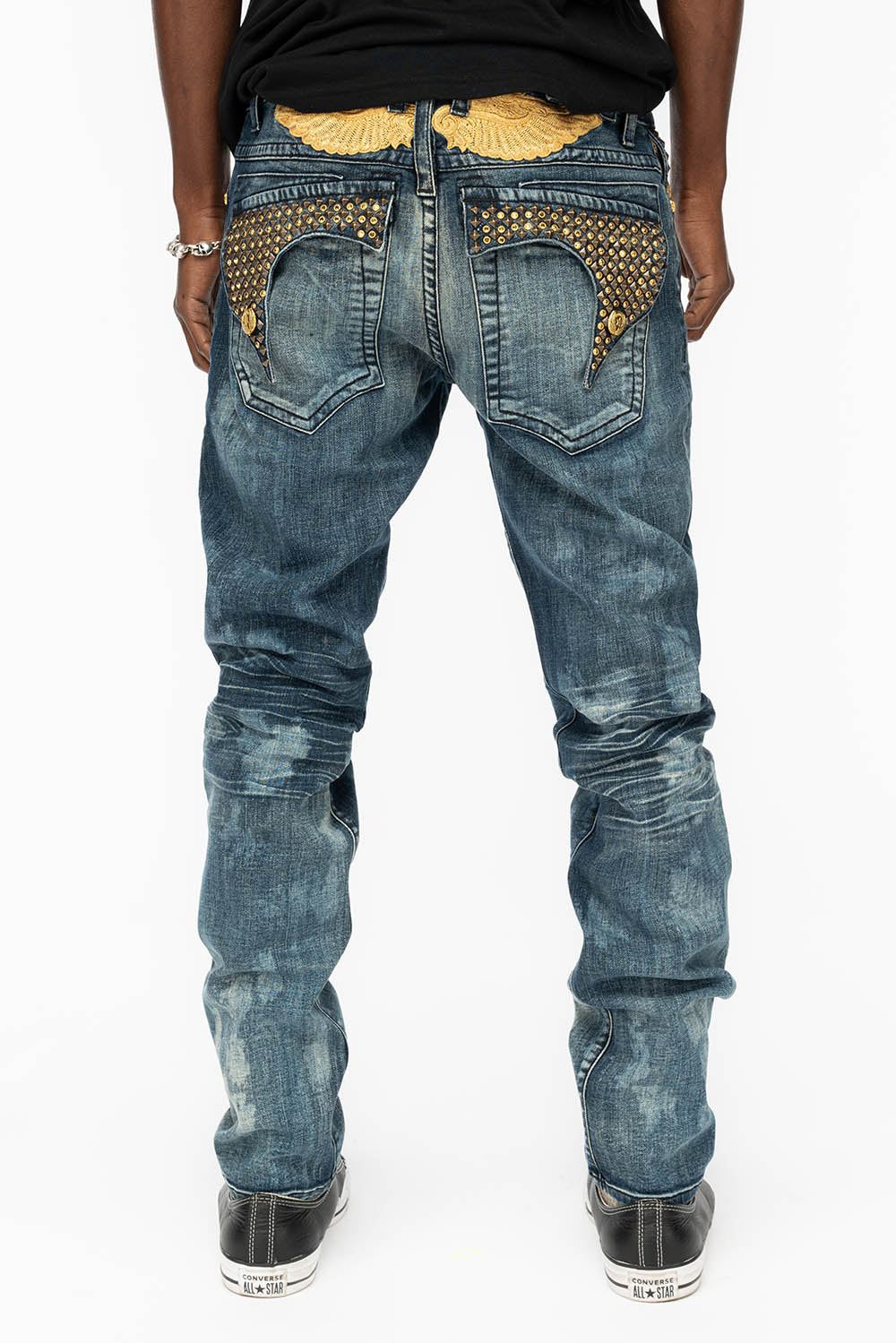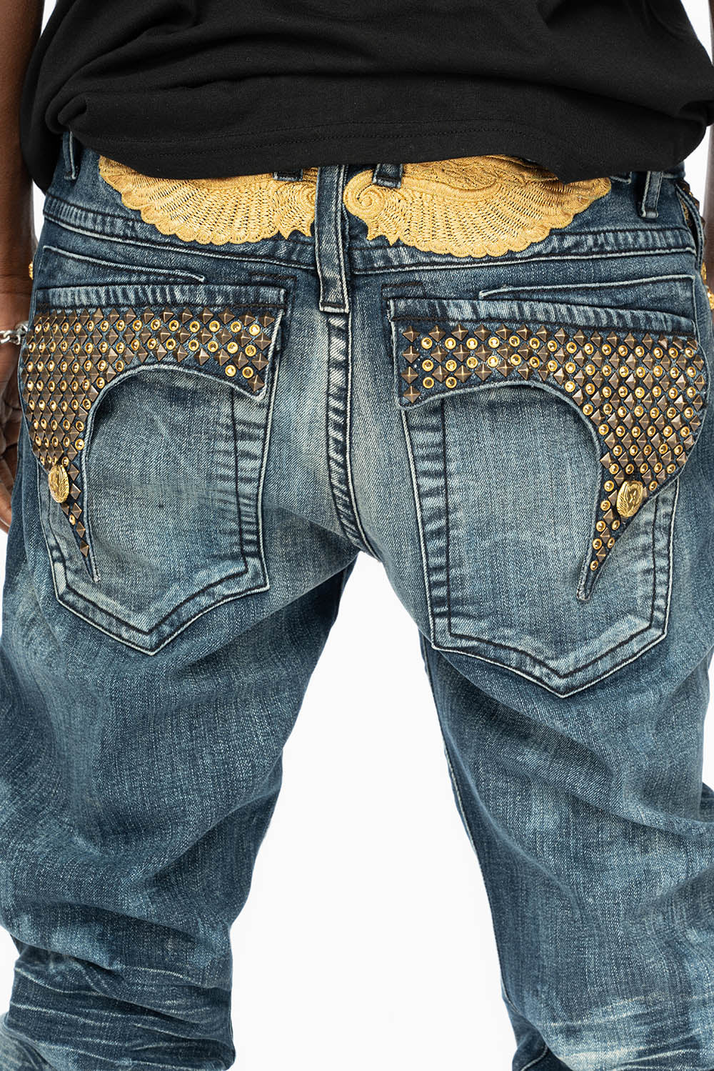 Robin's Killer Flap jeans in New Cloud Japan with gold wings embroidery on back and fully embellished with Antique Brass Pyramid and Arum Crystals . This jean comes in specialty blue wash, skinny fit, and constructed using premium stretch denim for both comfort and style.