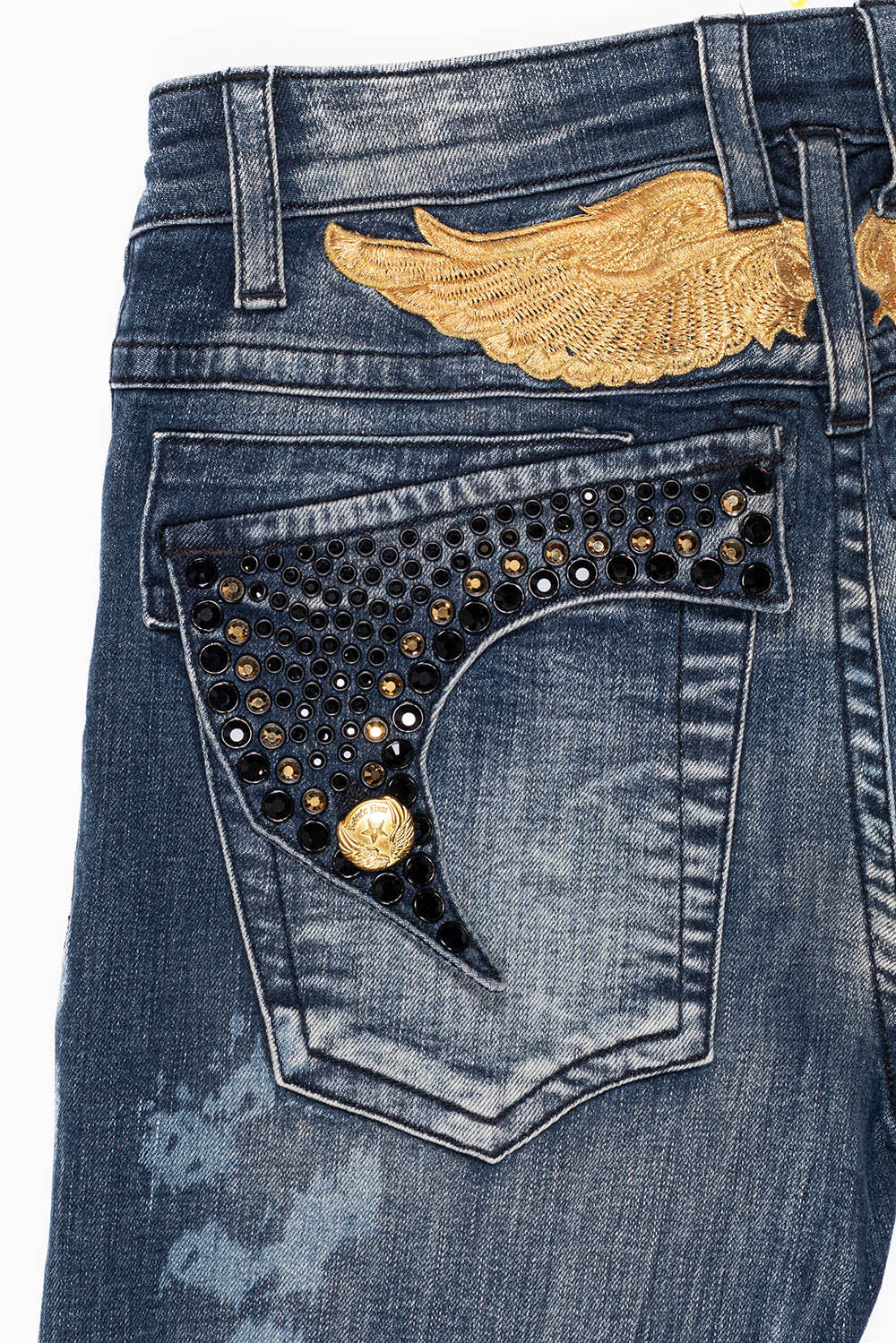 Robin's Killer Flap jeans in New Japan Medium Blue Wash with gold embroidered wings and full crystal embellished pockets with Large and small Jet Blk Crystals and Medium size Aurum gold crystals. These jeans are specialty washed, they are fitted with 24K plated hardware, skinny fit, and constructed using premium stretch denim for both comfort and style.