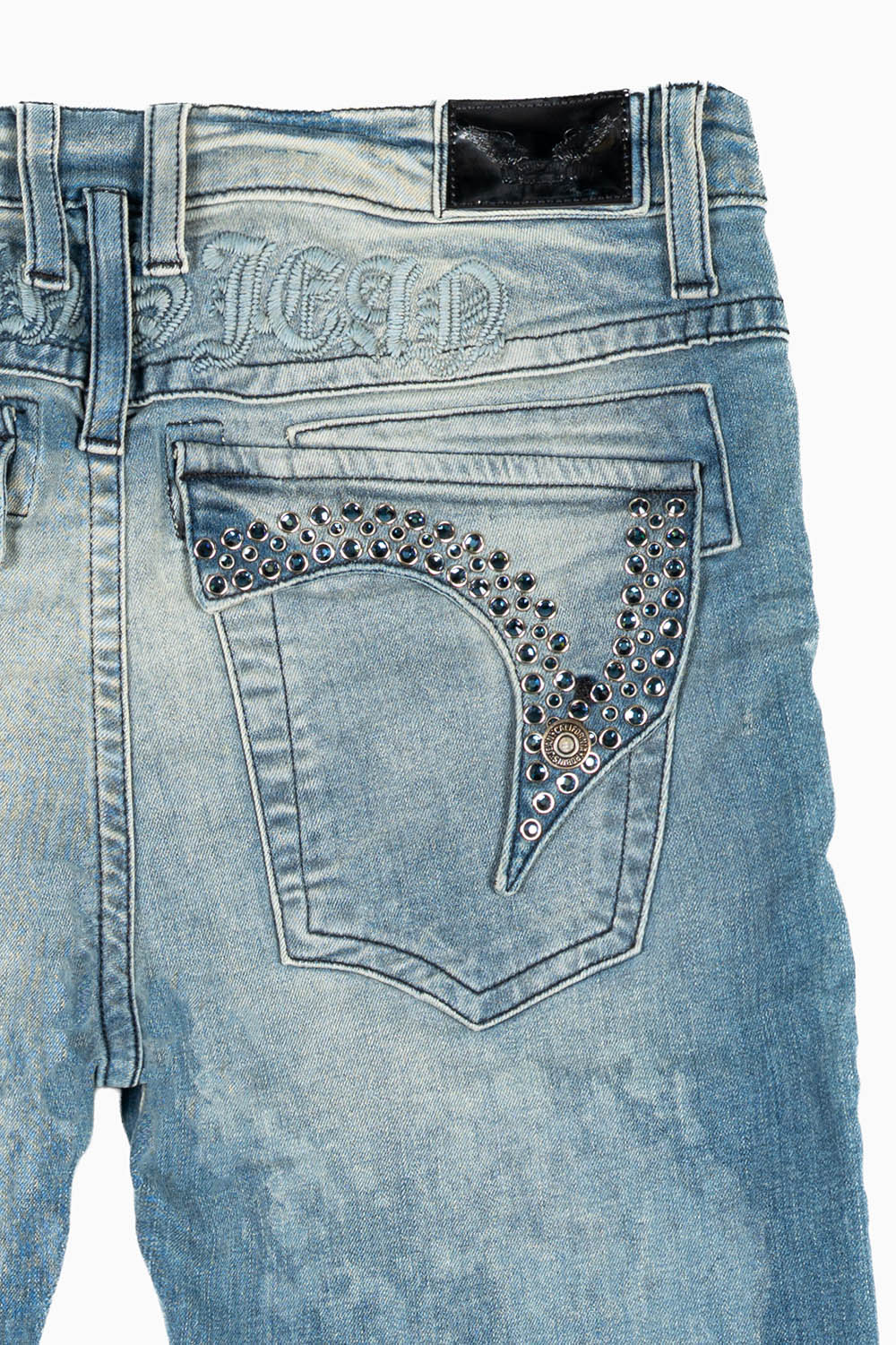 Robin's Killer Flap jeans in Odessa Vintage Medium Wash with embellished pockets of Montana Crystals. These jeans are specialty washed, they are fitted, skinny fit, and constructed using premium stretch denim for both comfort and style.