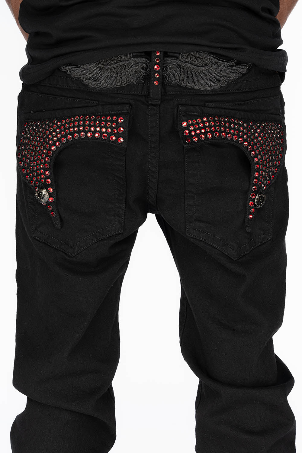 Robin's Killer Flap jeans in Pure Black Wash with Black Tonal embroidered wings and fully embellished pockets of Small and Large RED Crystals. These jeans are specialty washed, skinny fit, and constructed using premium stretch denim for both comfort and style.