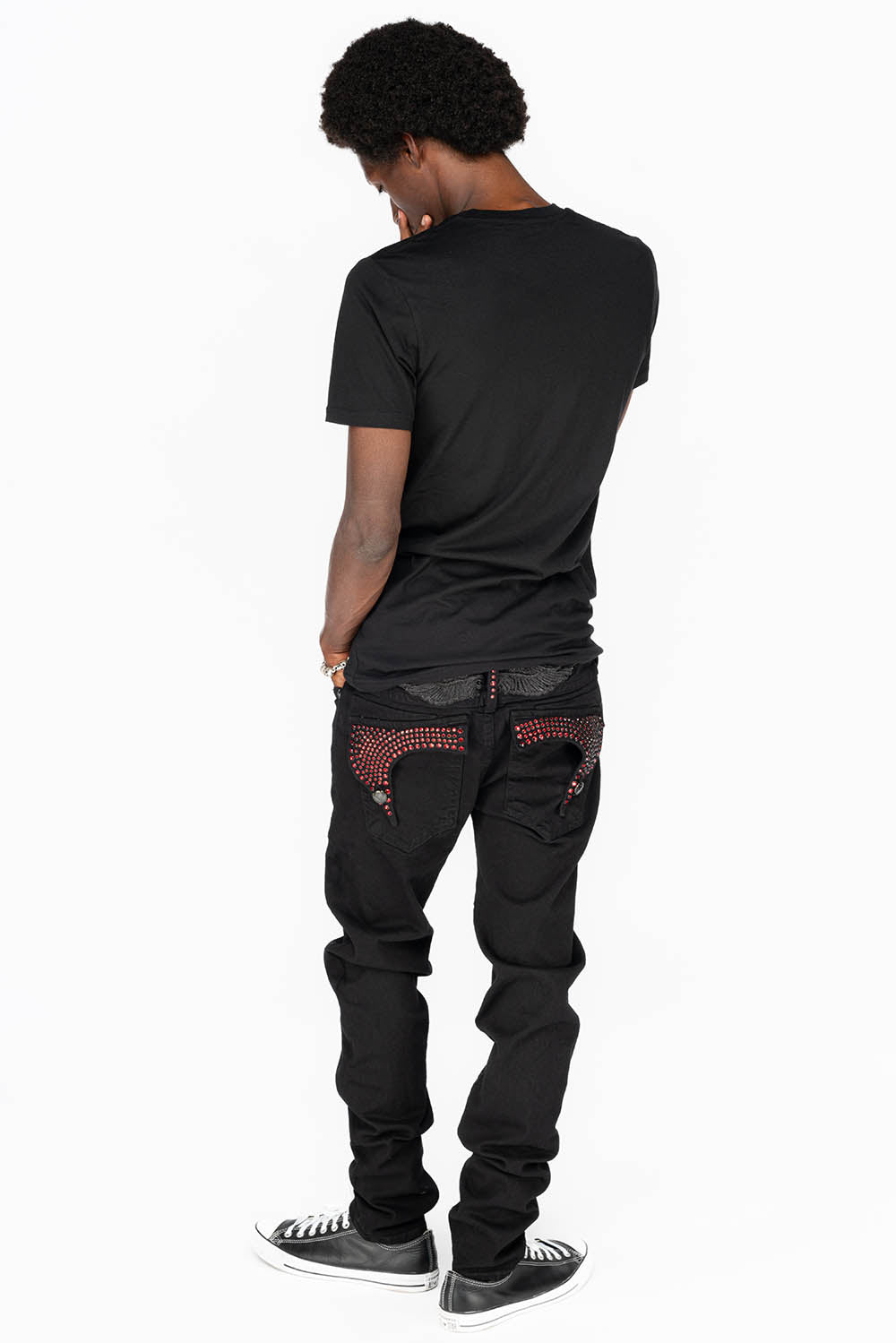 KILLER FLAP MENS SKINNY JEANS IN PURE BLACK WITH BLK TONAL WINGS AND FULL RED CRYSTALS