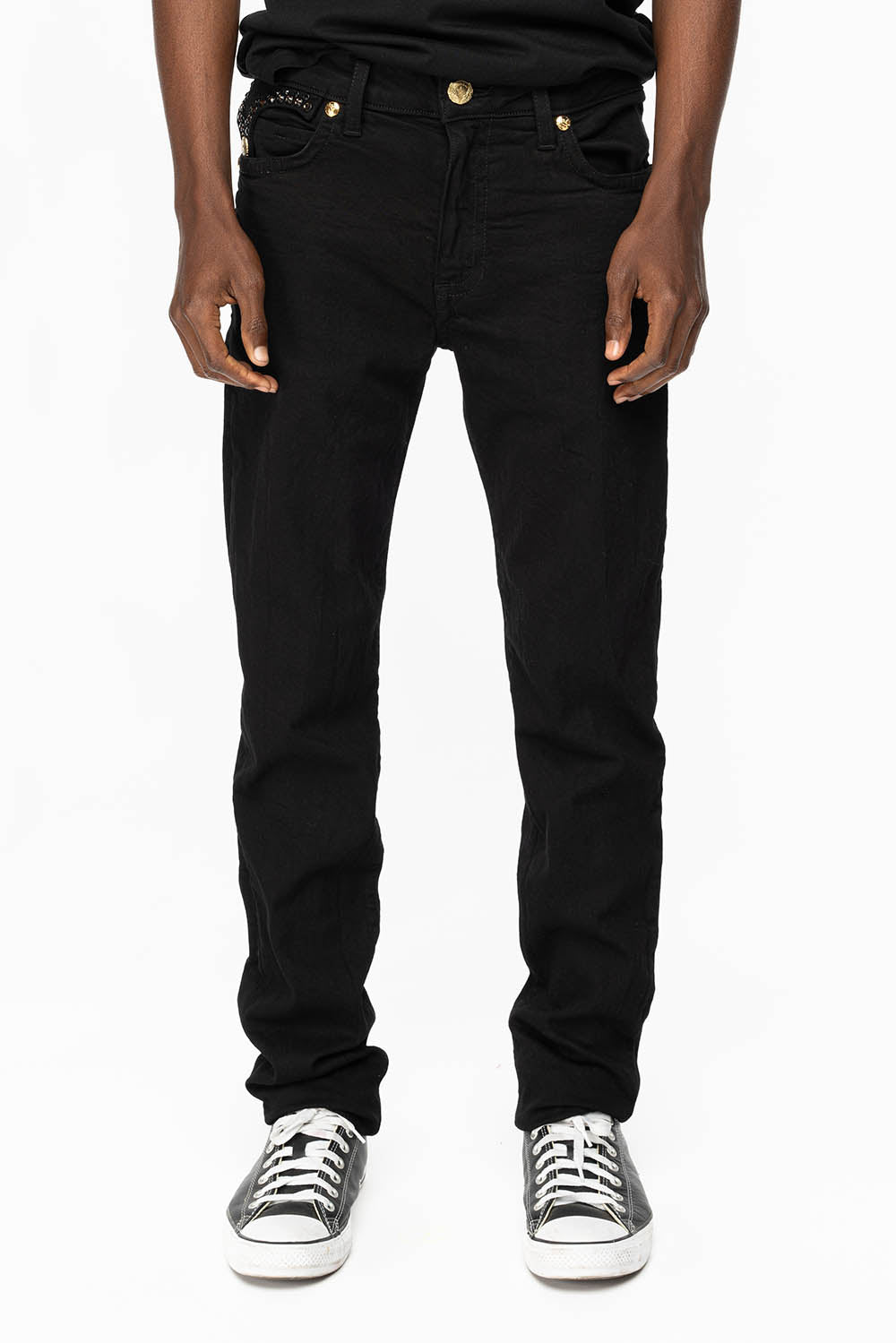 KILLER FLAP MENS SKINNY JEANS IN PURE BLACK WITH GOLD ROBIN’S LOGO AND CRYSTALS