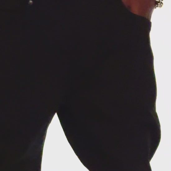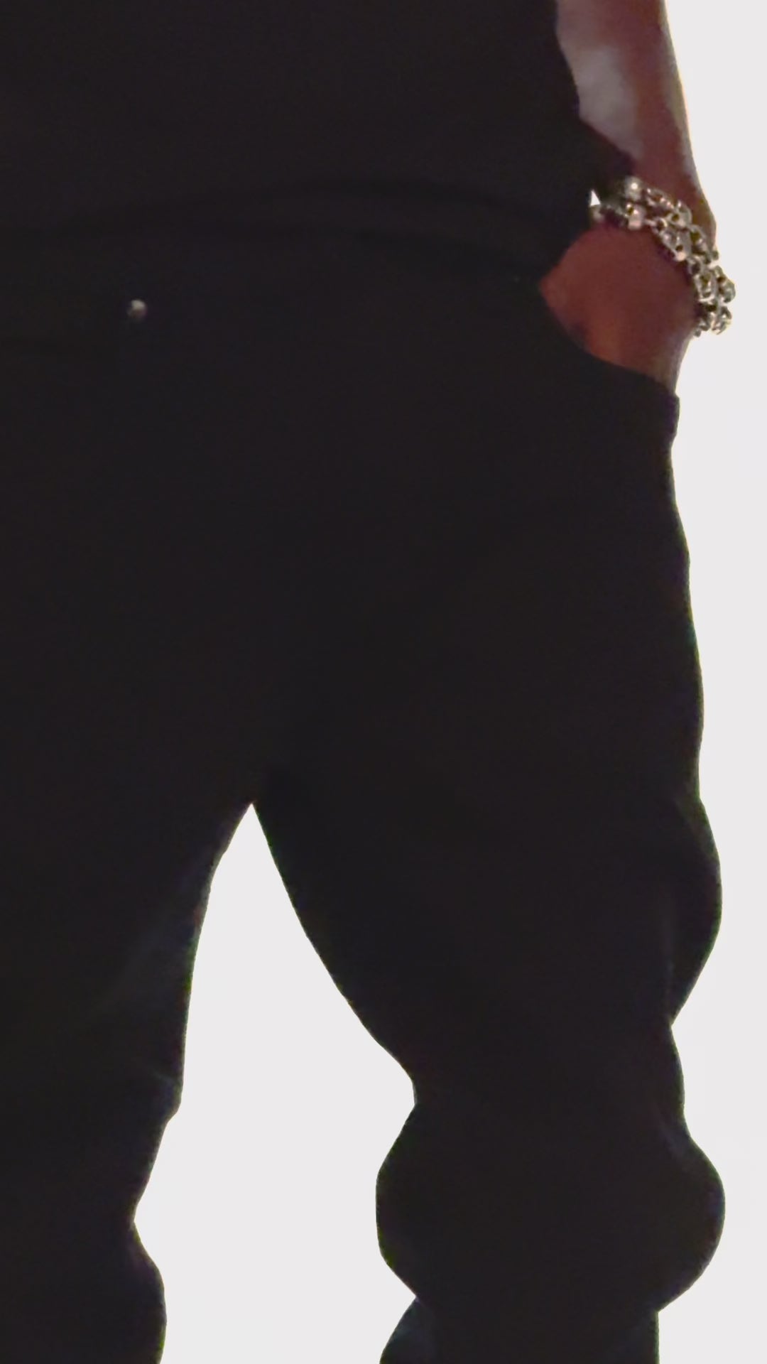 - Back pocket flaps, back belt loop and back pocket seams embellished with Jet Black and Black Diamond crystals with black rims.