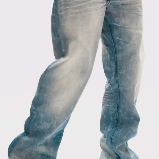 LONG FLAP STRAIGHT JEANS IN AQUARAMA WASH WITH TAN LEATHER INSERTS EMBELLISHED WITH CRYSTALS