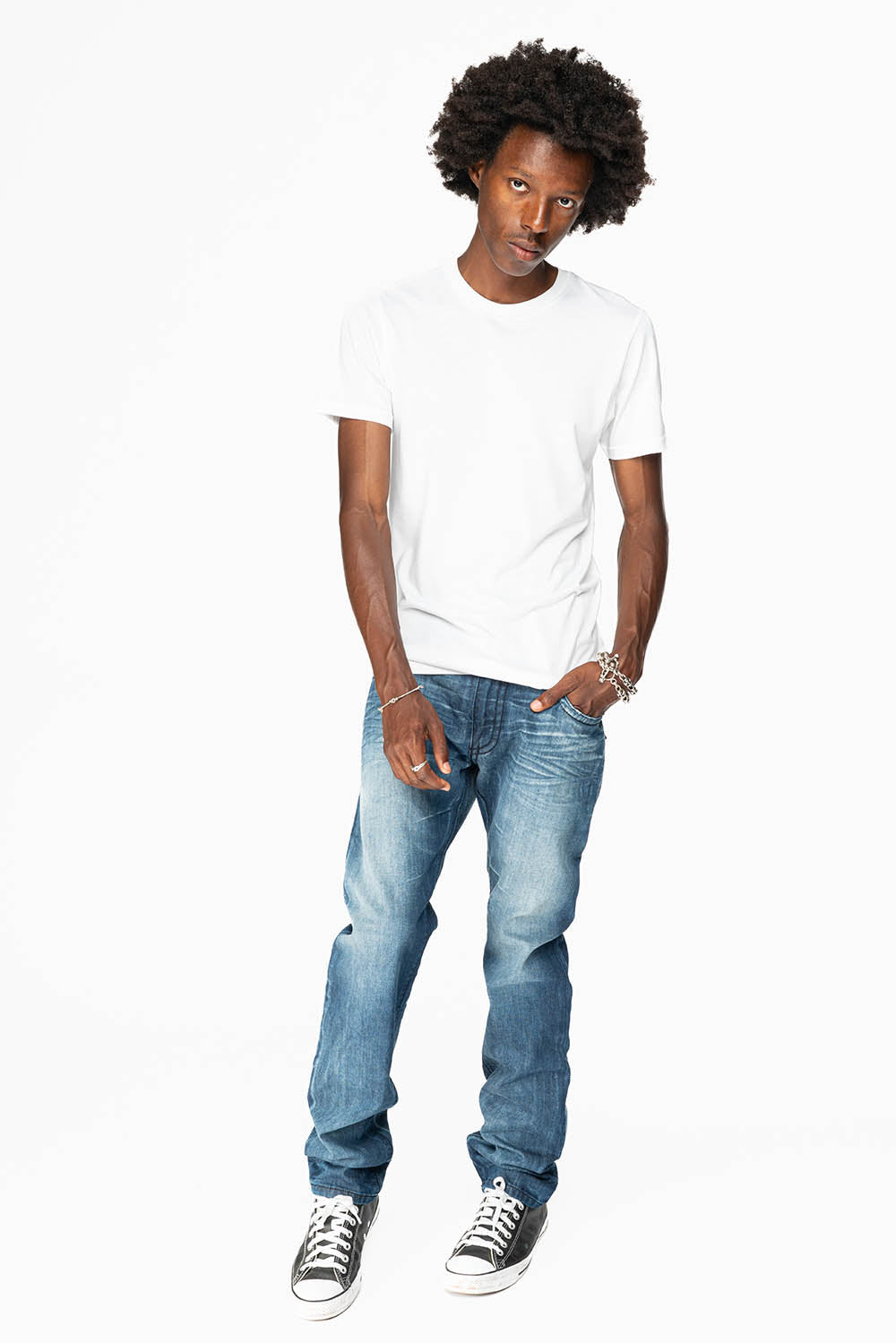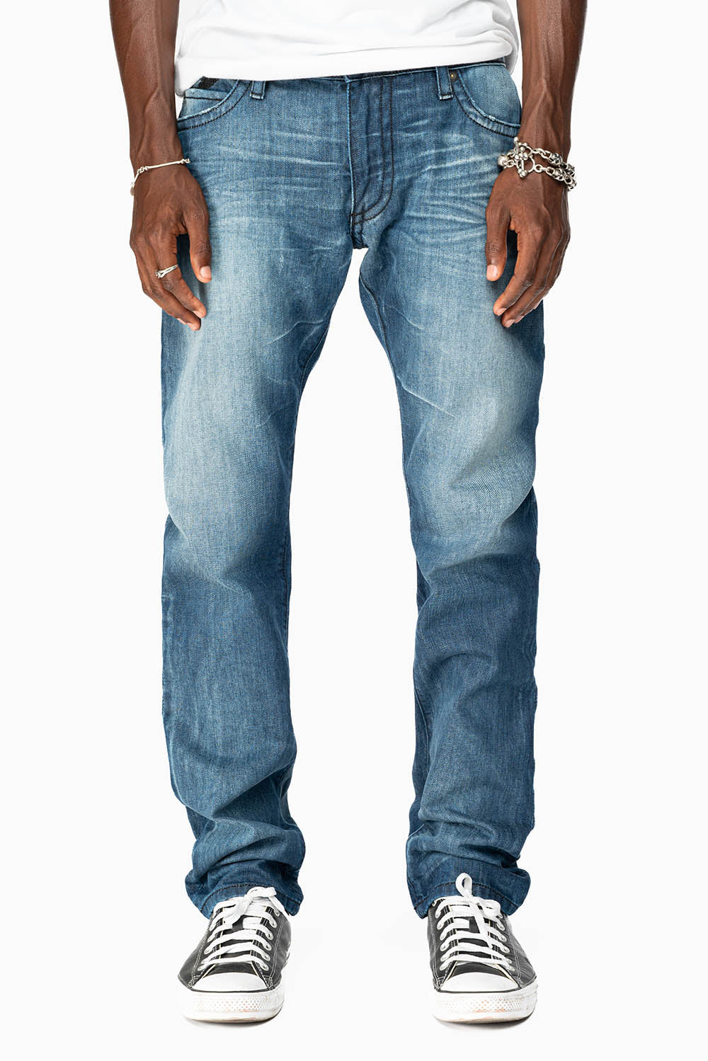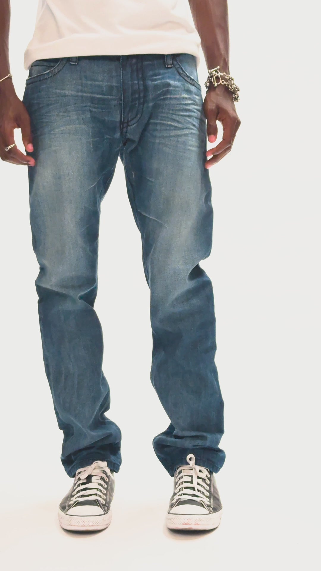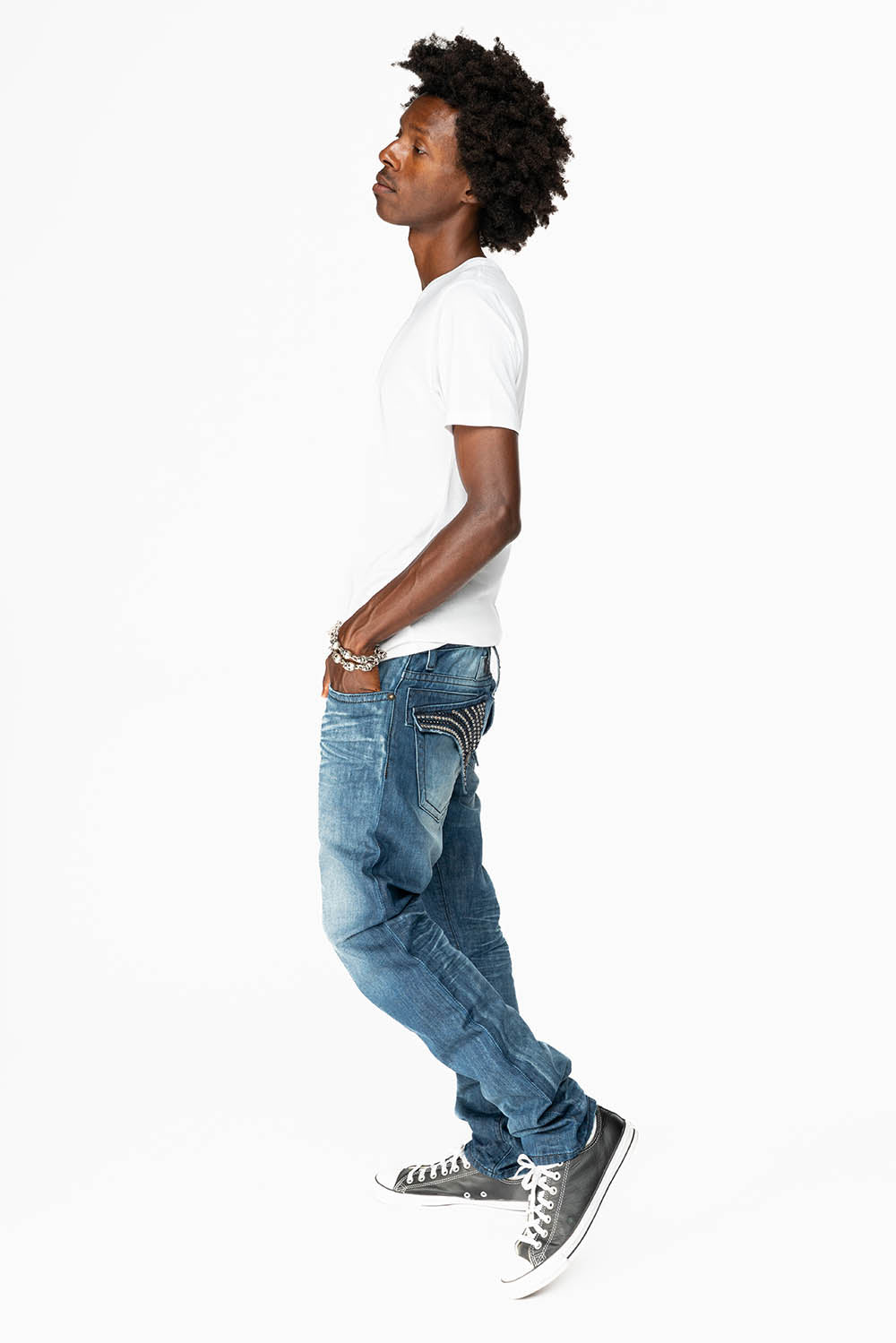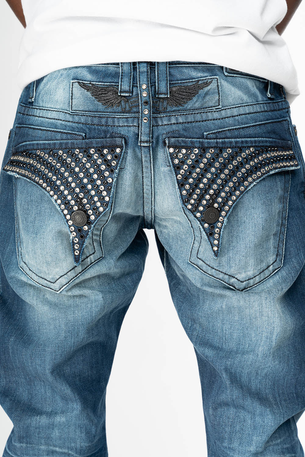 LIMITED EDITION MENS LONG FLAP SLIM JEANS EMBELLISHED WITH CRYSTALS IN OMAHA DARK WASH