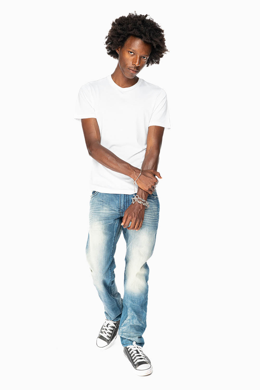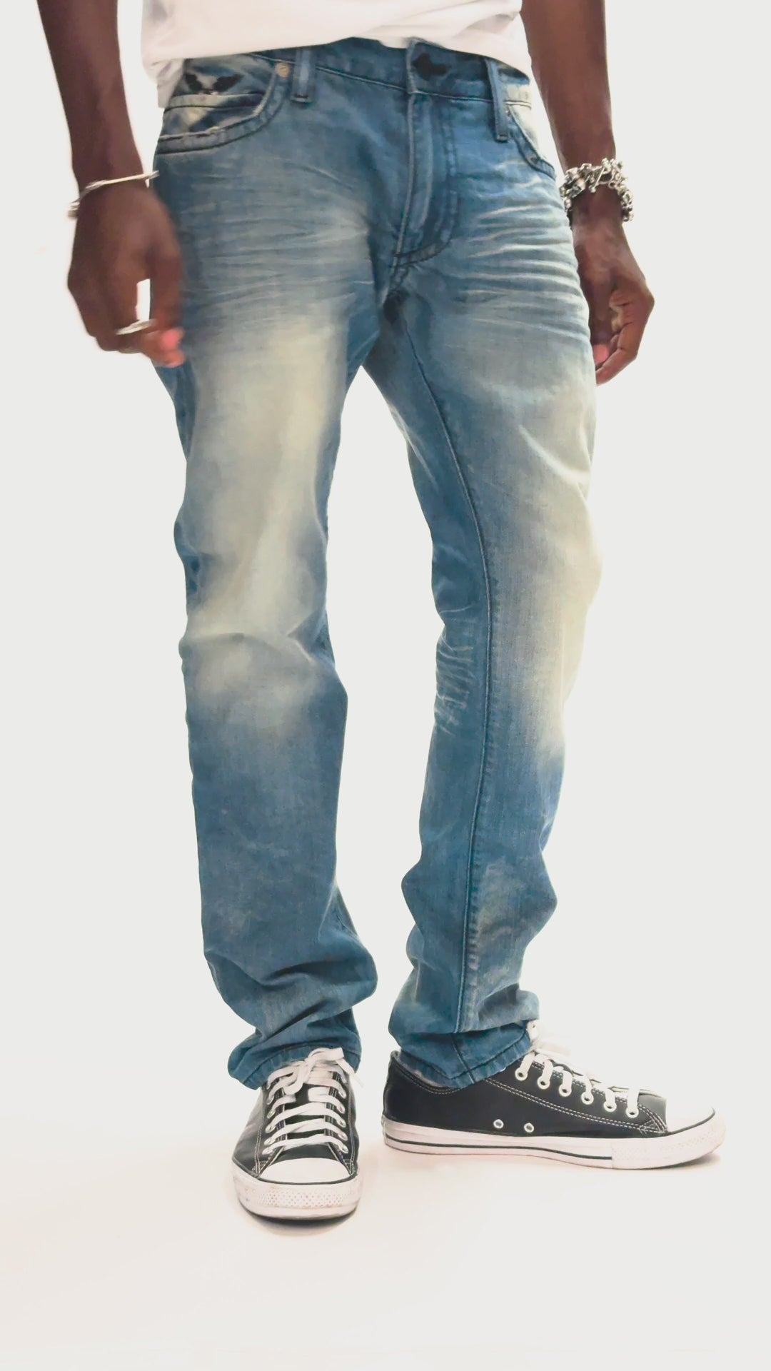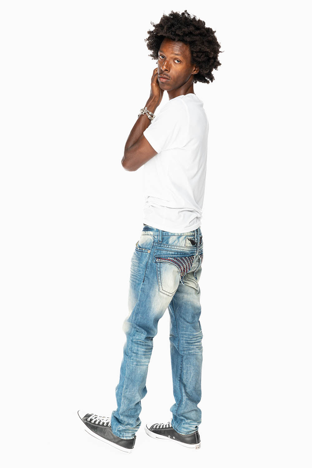LIMITED EDITION MENS LONG FLAP SLIM JEANS EMBELLISHED WITH CRYSTALS IN OMAHA TAN WASH