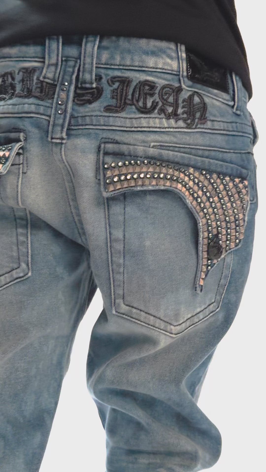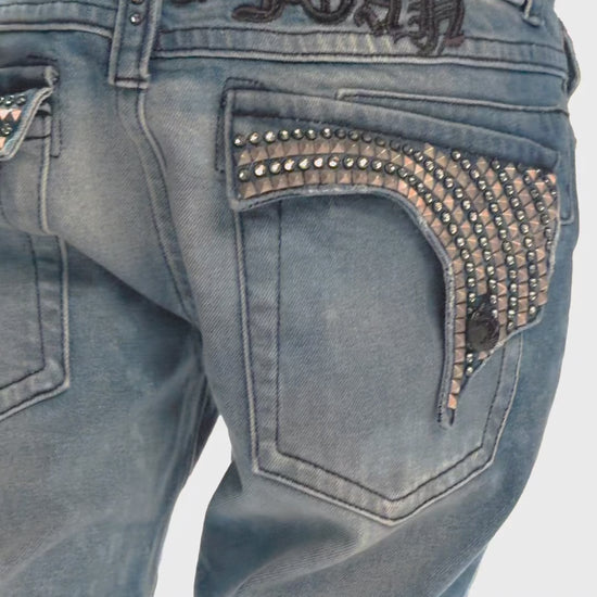 Robin's signature Killer Flap jeans in Crystal Blue wash with embroidery and pocket flaps embellished with studs and crystals. These jeans are specialty soft wash in blue family wash, skinny leg fit, and constructed using premium stretch denim for both comfort and style.