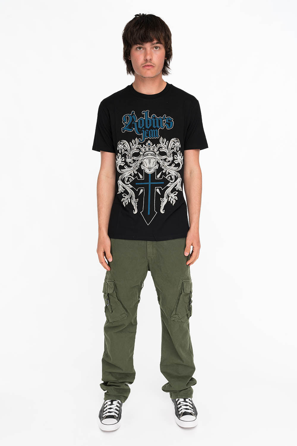 Robin's silver helmet tee in silver glitter and blue graphics on black.