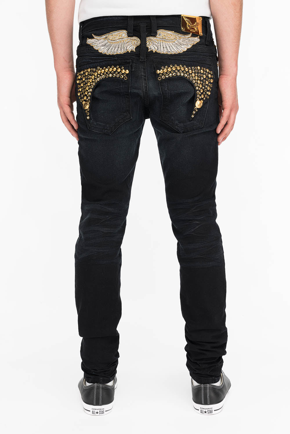 Robin's Killer Flap jeans in F_Up Black Wash with indigo/gold embroidery and full crystal/spiked embellishment. These jeans are specialty washed, fitted with 24K plated hadware, skinny fit, and constructed using premium stretch denim for both comfort and style.