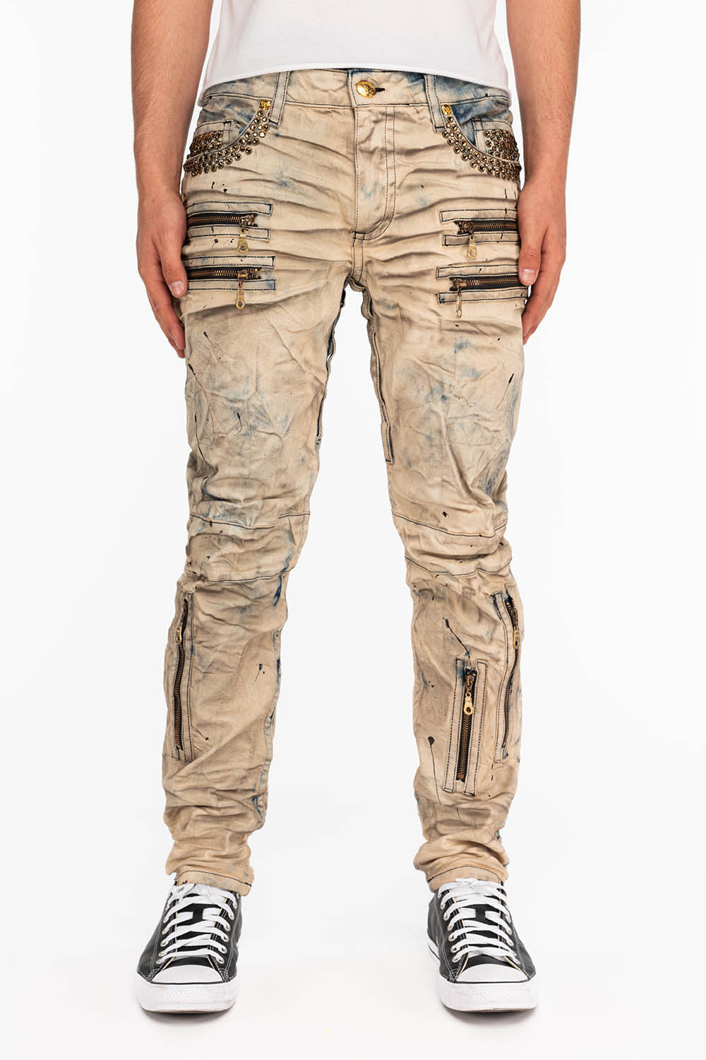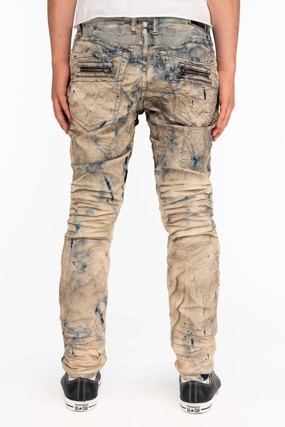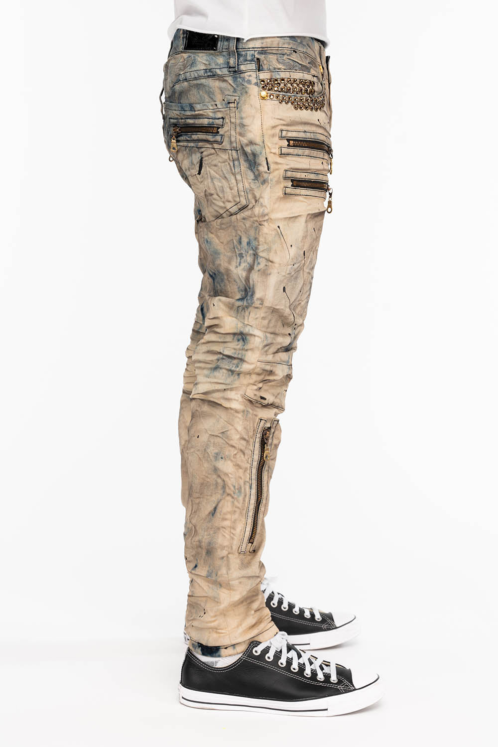Robin's New Biker jeans in Tie Dye Blue Wash with indigo embroidered wings. These jeans come with beautifull smokey topaz embellished pockets. They also feature and a 24 karat button closure and rivets. These pants are constructed using premium stretch denim for both comfort and style.