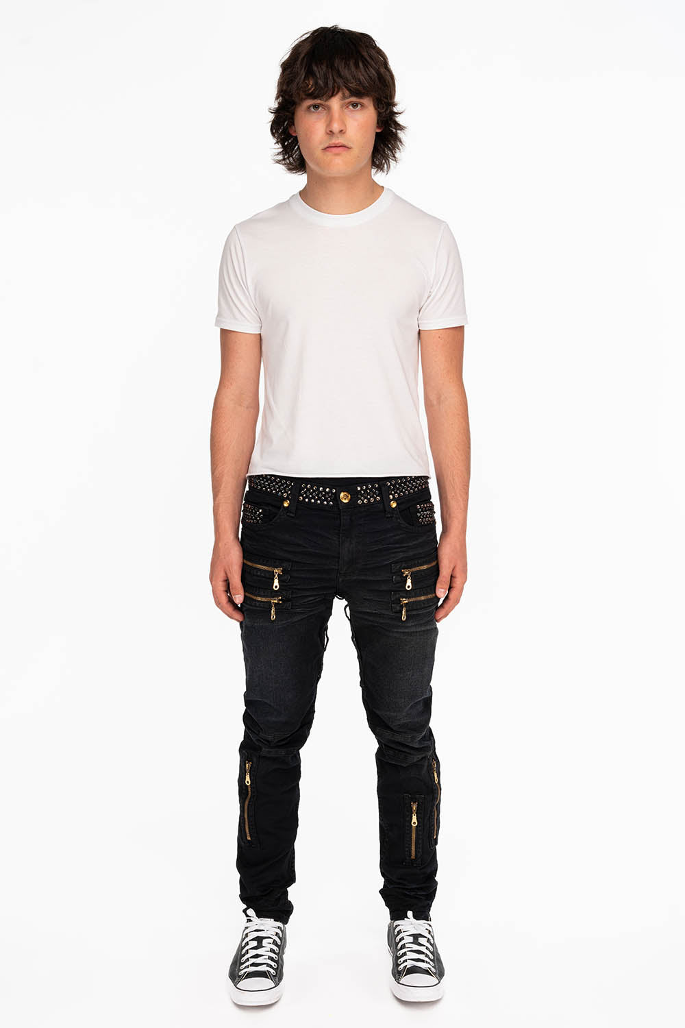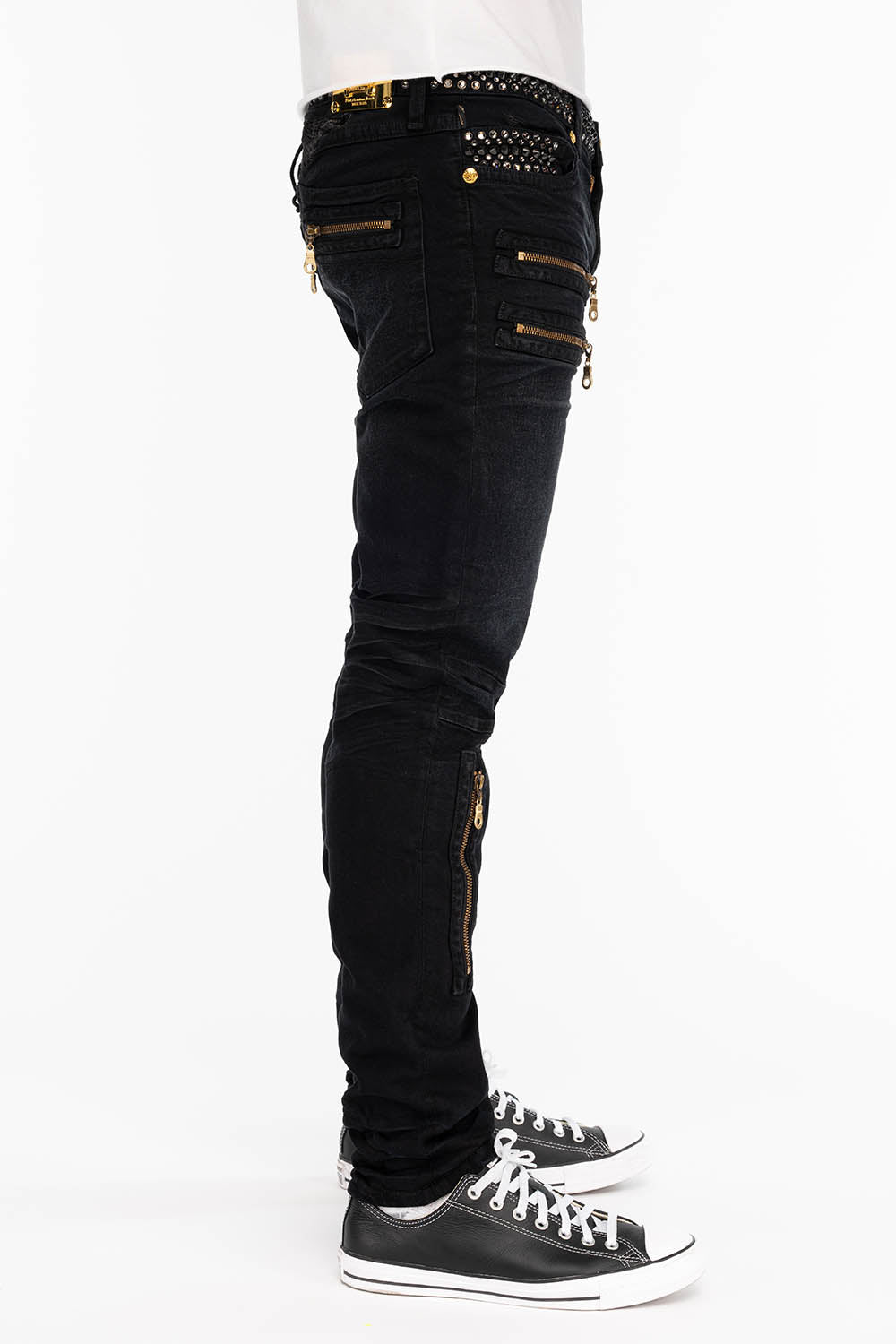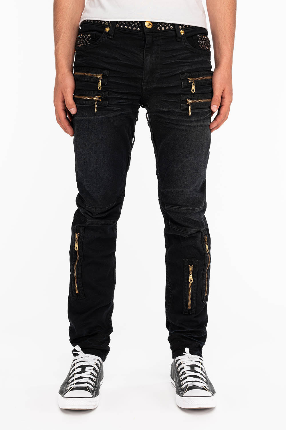 Robin's New Biker jeans in F_Up Black Wash (non ripped version) with metallic black embroidered wings. These jeans come fully loaded with beautiful black diamond crystal, and black spike embellishment on waistband and upper pockets. They also feature and a 24 karat button closure, rivets and tag. These pants are constructed using premium stretch denim for both comfort and style.