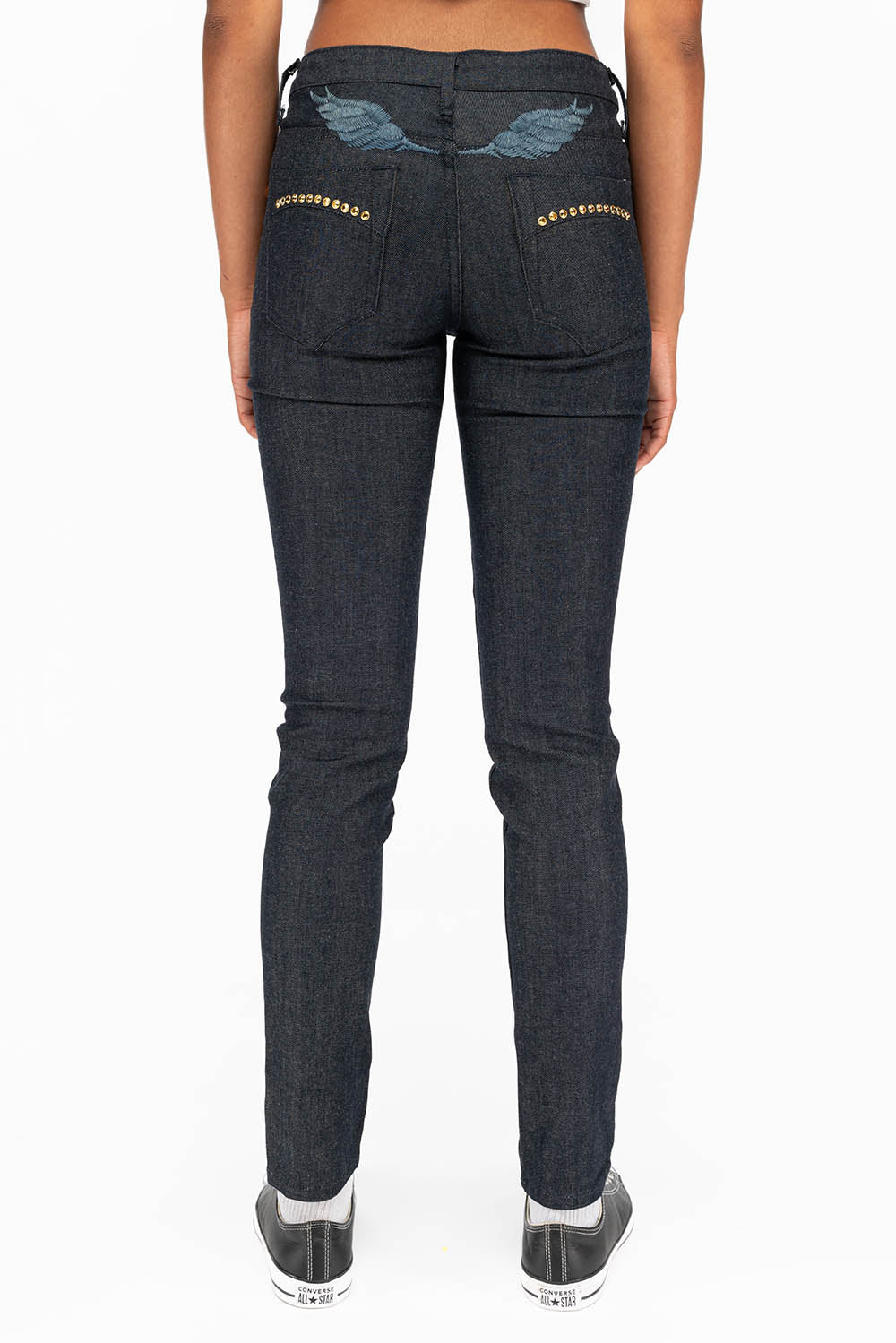 Premium Raw Denim Classic 5-Pocket Skinny Jeans w/ Natural Color Wing Embroidery across Yoke and Custom Gold Button. This jean is constructed using stretch denim and comes studded with Gold Rim Aurum Gold Crystals.
