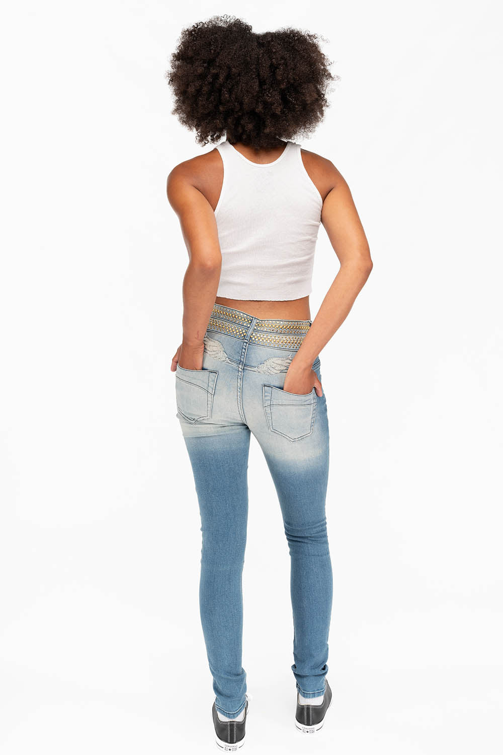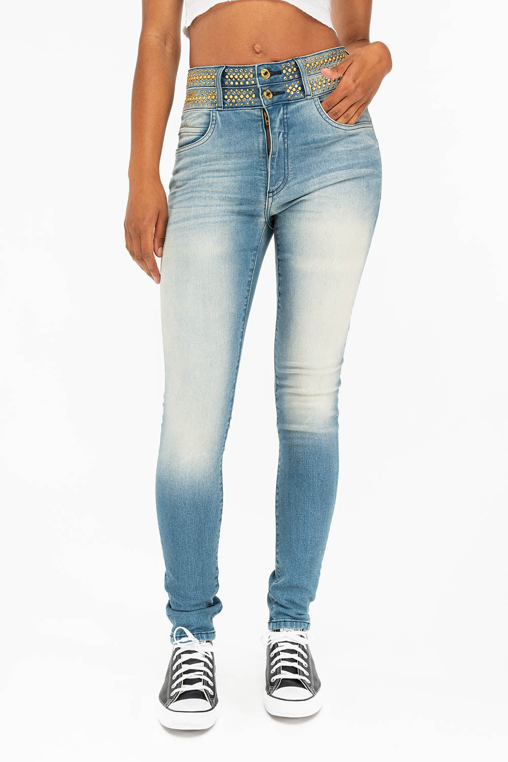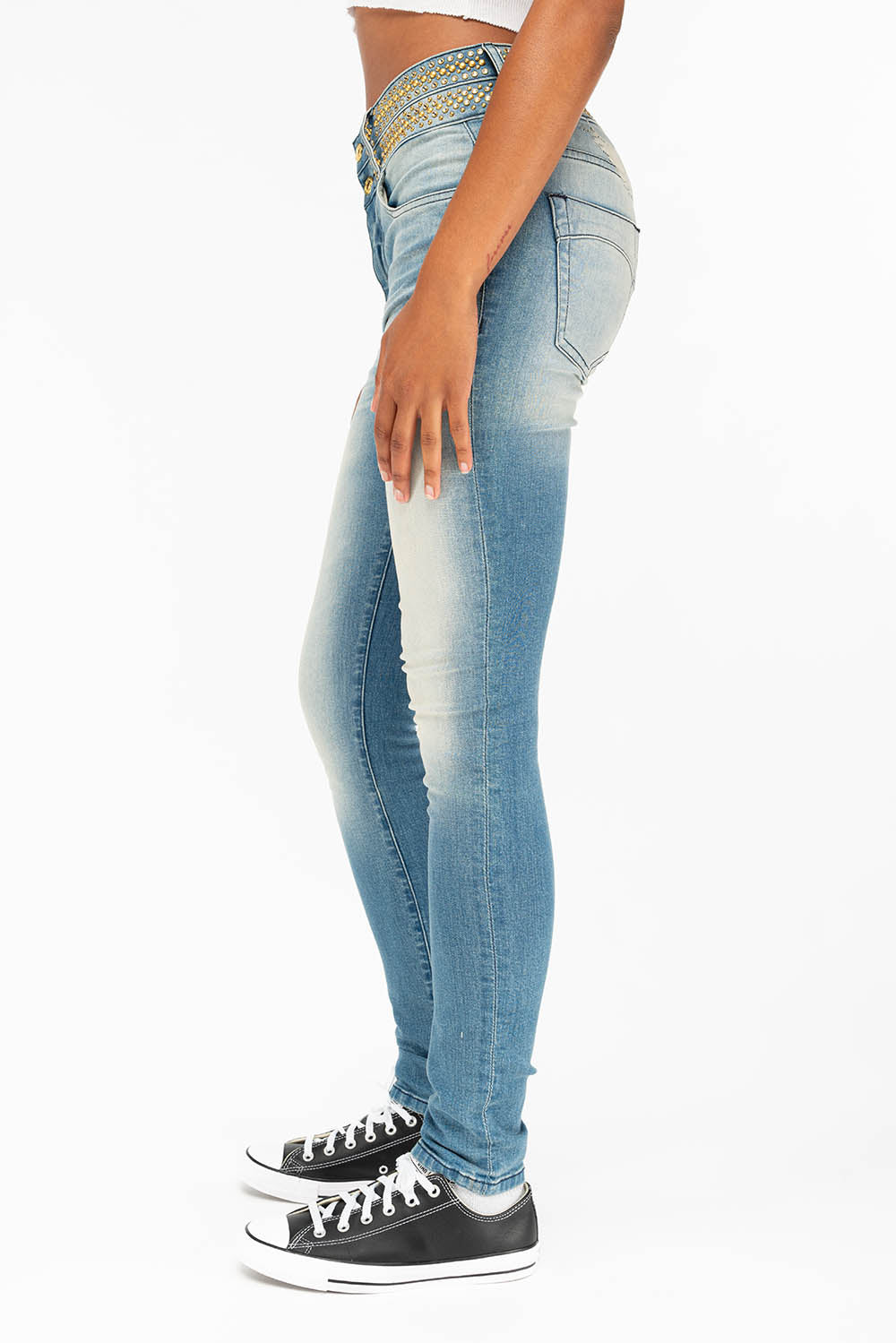 Robin's double waist skinny jean in Antique Light Blue with crystals and metal studding. These are a unique specialty double waistband style denim that are embellished with a beautiful combination of clear crystals mixed with gold round studding. These jeans are skinny fit, and constructed using premium stretch denim for both comfort and style.