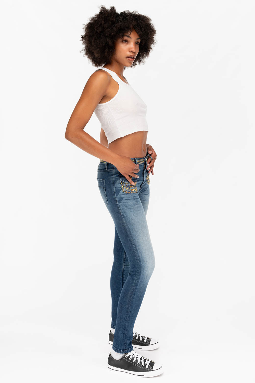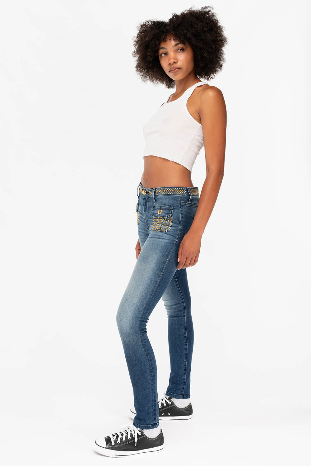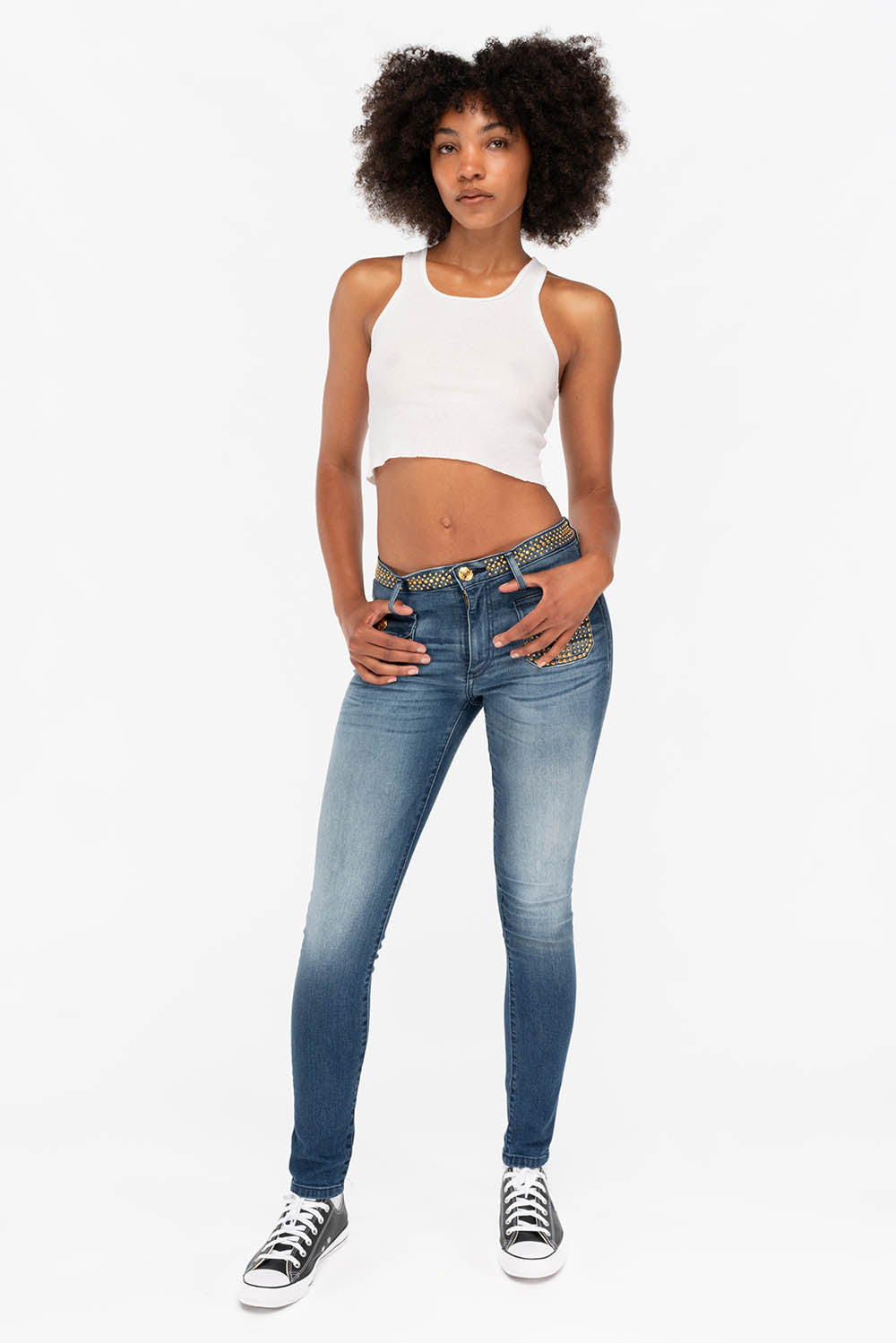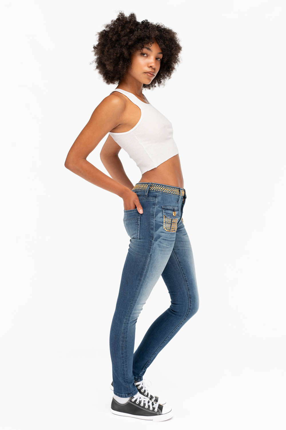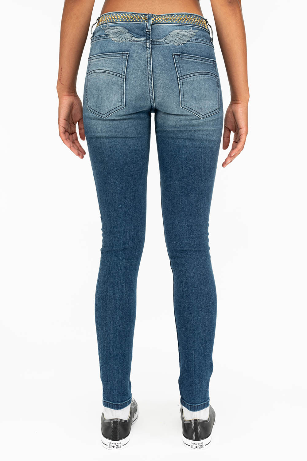 Robin's Lady G.I. skinny jeans in Antique Blue wash fully loaded with crystals and studding. This brand new style combines military detailing with a classic skinny fit. These jeans feature; ornate gold buttons, beautiful gold crystal/metal combination embellished utility pockets and waistband, and tonal embroidered wings on the back. They are constructed using a lightweight premium stretch denim, for both superior comfort and unmatched style.