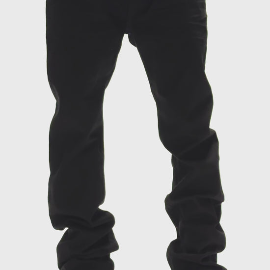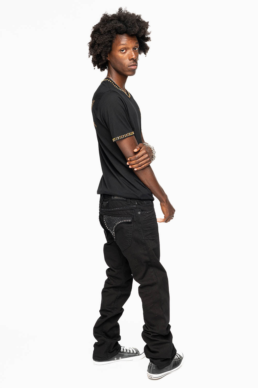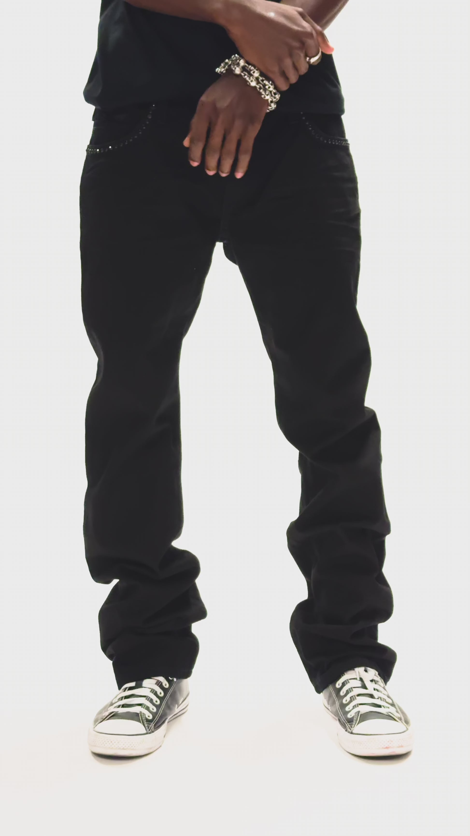 MENS CLASSIC STRAIGHT LEG LONG FLAP JEANS WITH JET BLK AND BLK DIAMOND CRYSTALS IN PURE BLK
