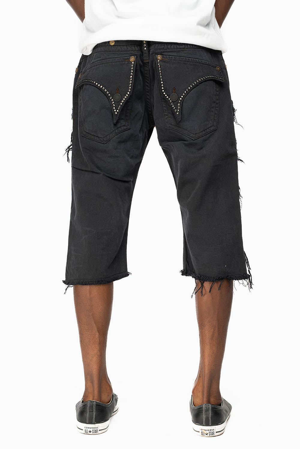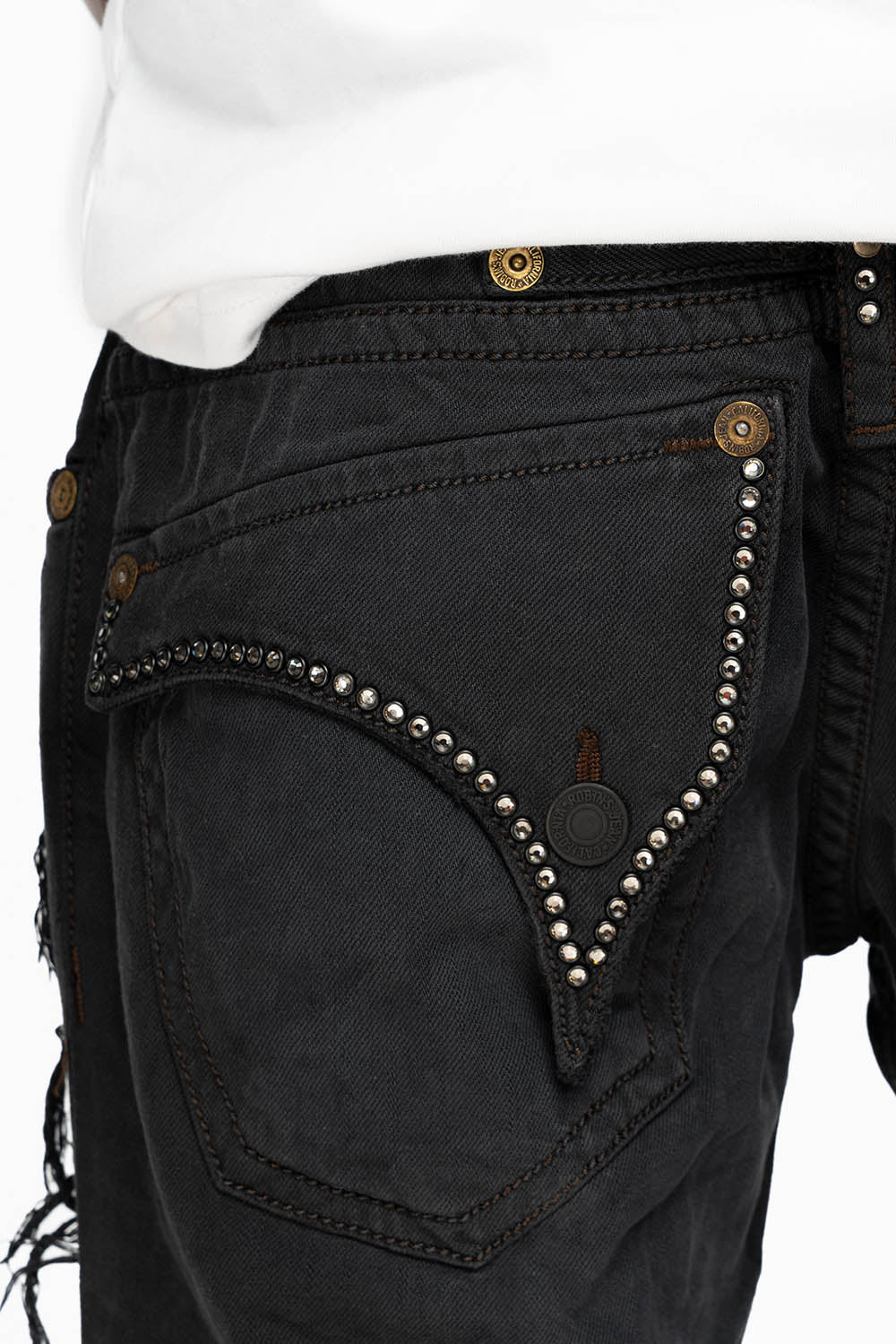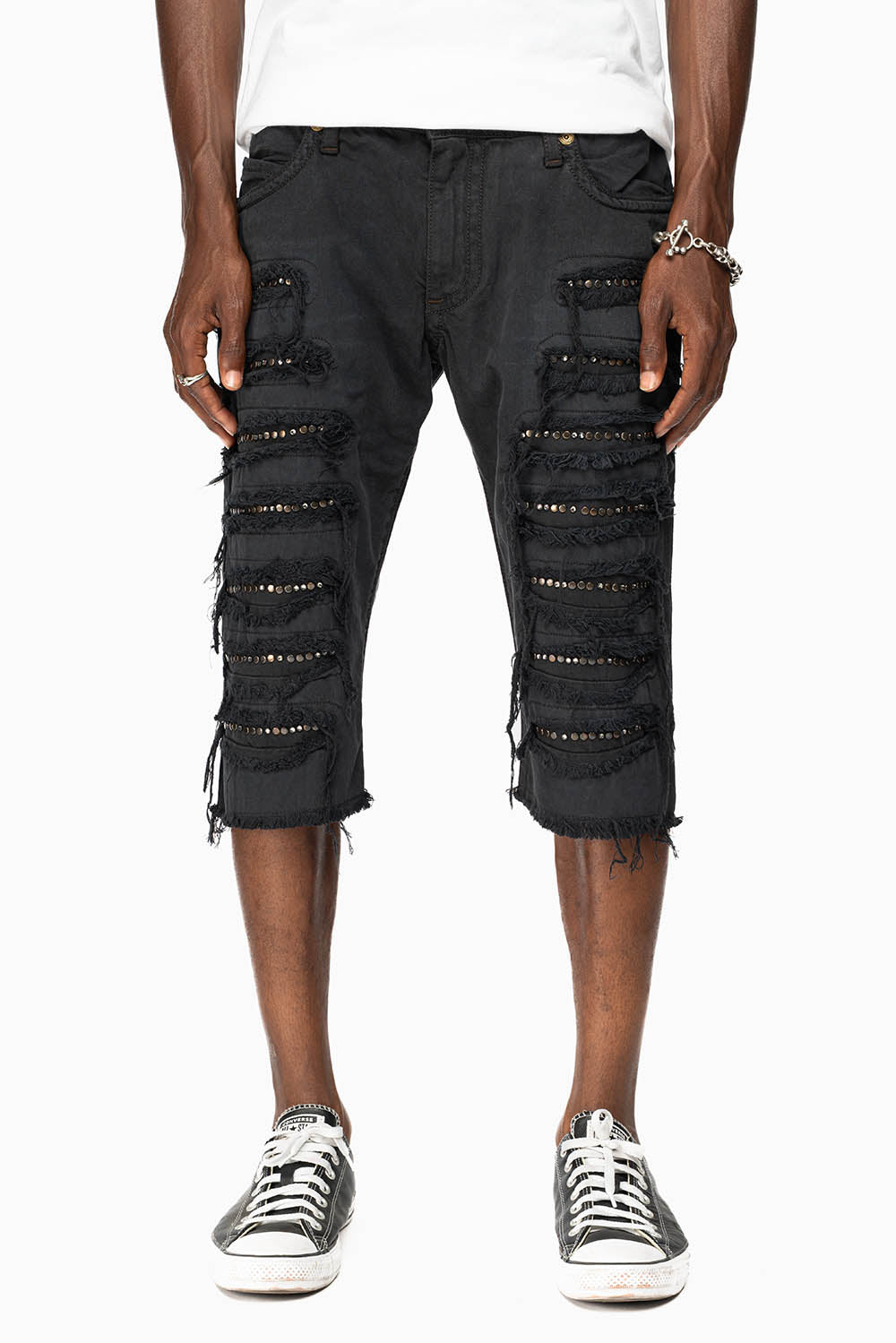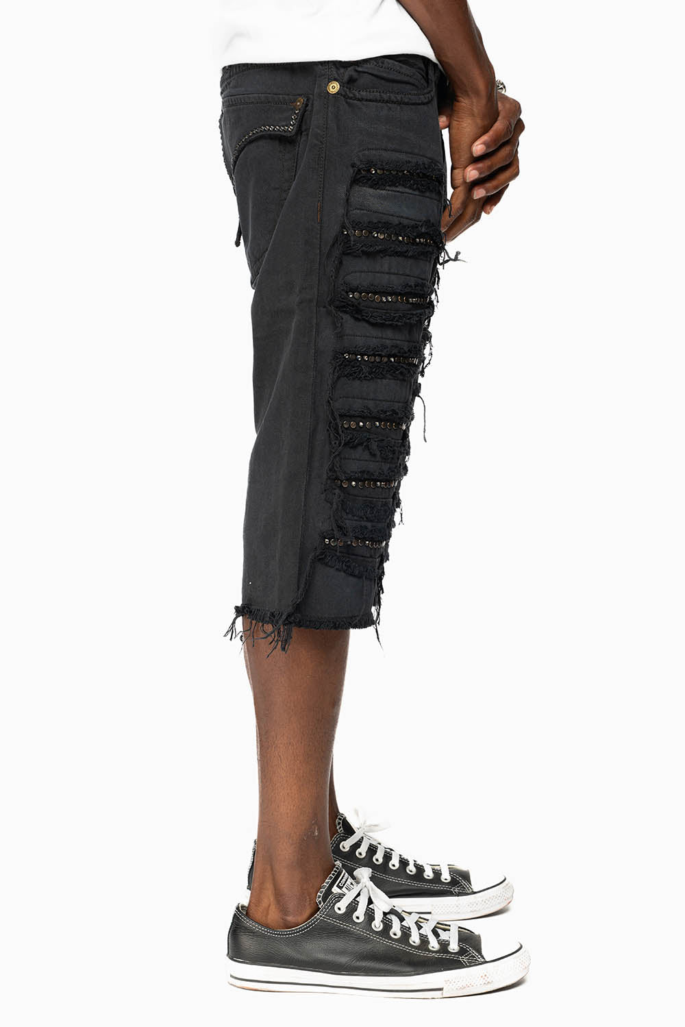 MENS DESTROYED SHORTS WITH KILLER FLAP POCKET IN BLACK WITH STUDS AND CRYSTALS