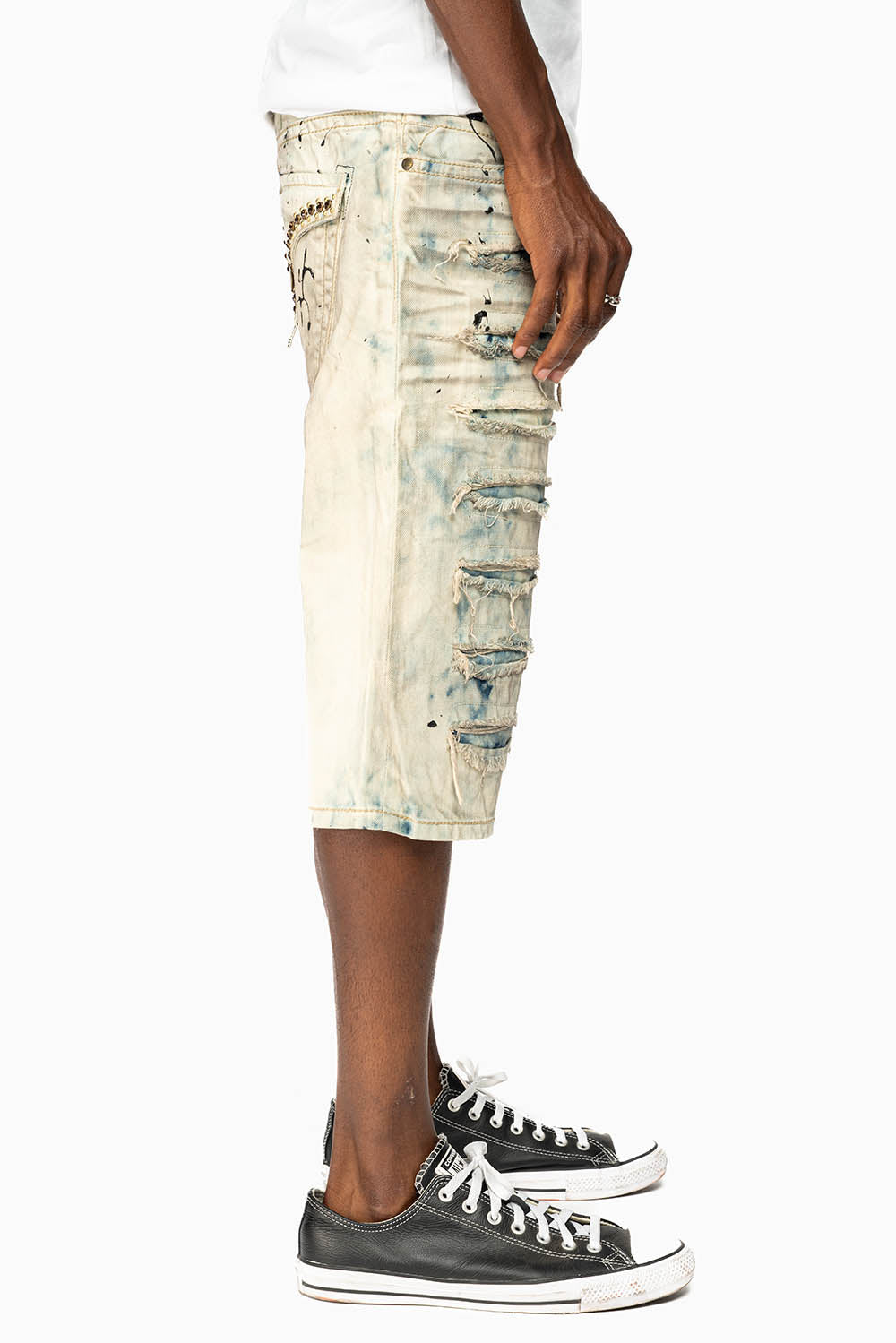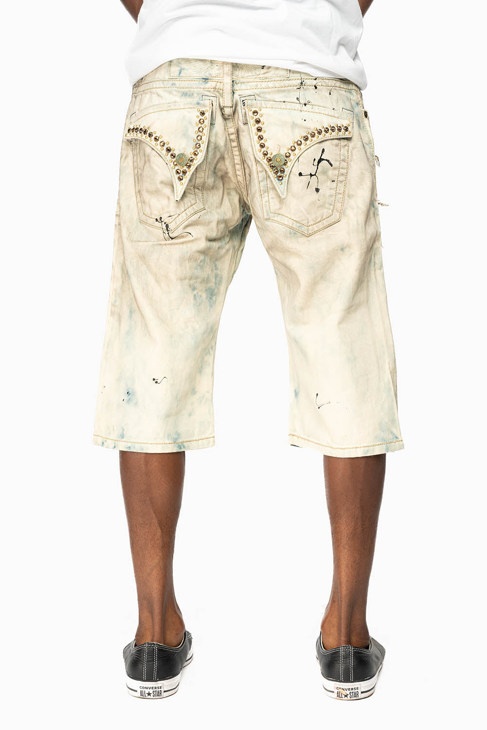 MENS DESTROYED SHORTS WITH KILLER FLAP POCKET IN FROZEN WASH WITH STUDS AND CRYSTALS