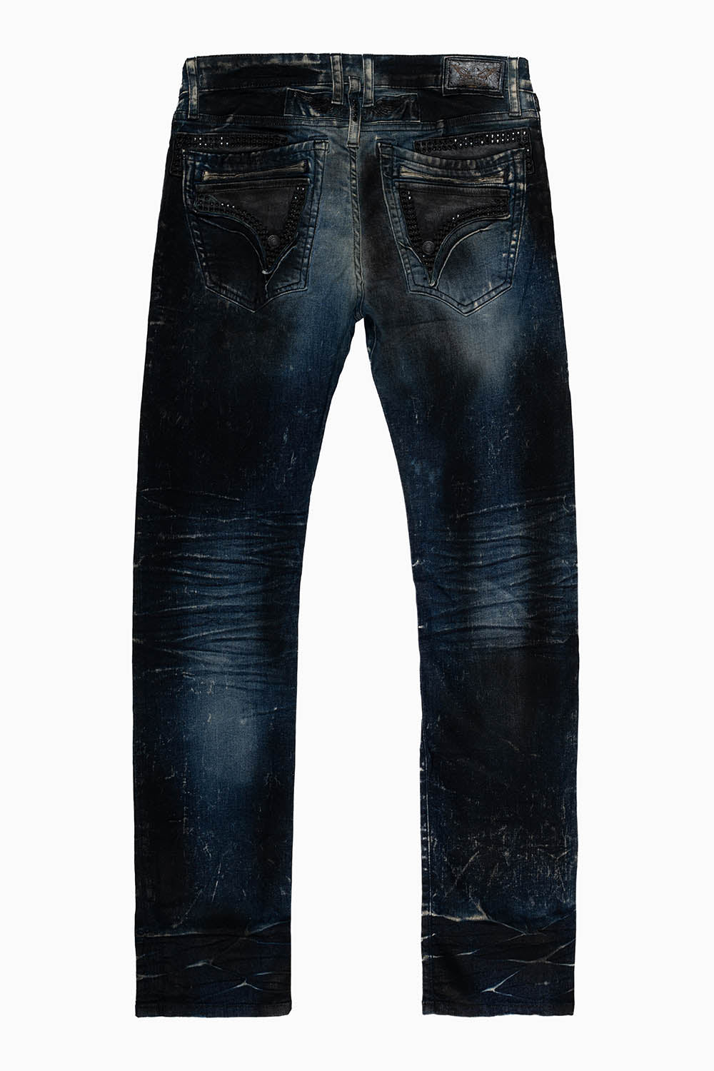 MENS FLAP POCKET SLIM JEANS IN DARK BLUE 5D SEMI COATING WASH WITH CRYSTALS