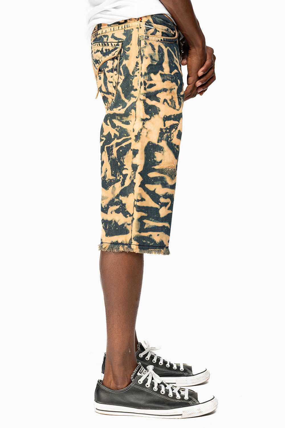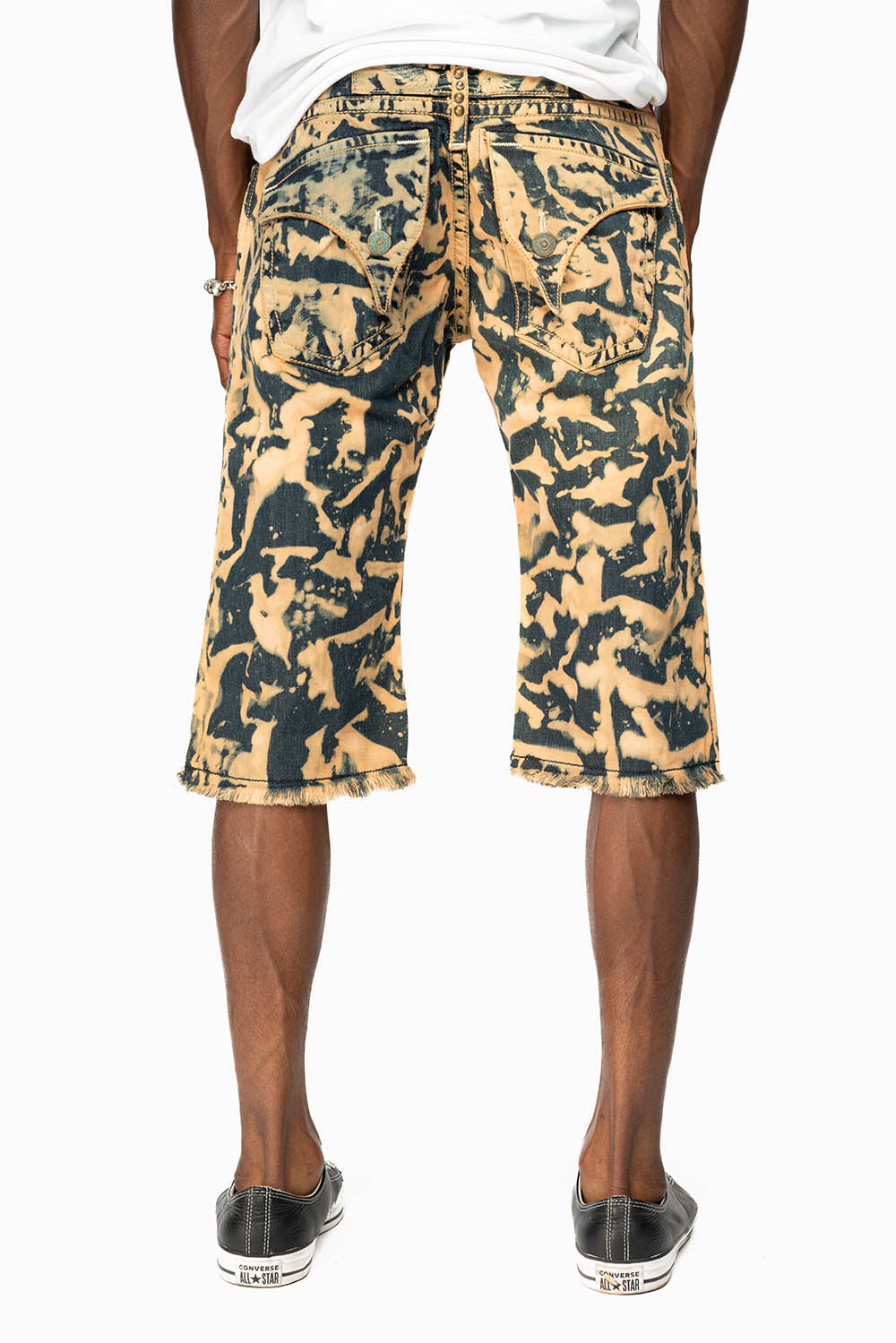 Robin's Salt Khaki Broken wash shorts. These shorts come in a high contrast patchy wash mixing two complementary tones: light orange and dark indigo . They have signature back pocket long flaps and are constructed using premium rigid denim for both style and durability.
