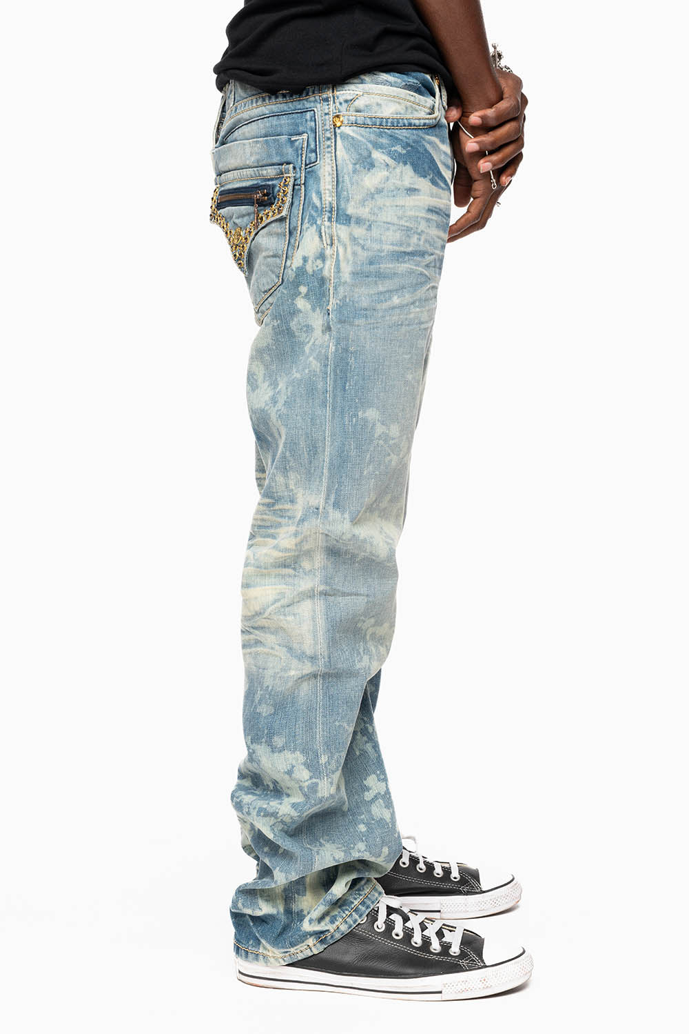 MENS SMALL FLAP POCKET STRAIGHT LEG JEANS IN ODESSA VINTAGE MEDIUM WASH WITH CRYSTALS