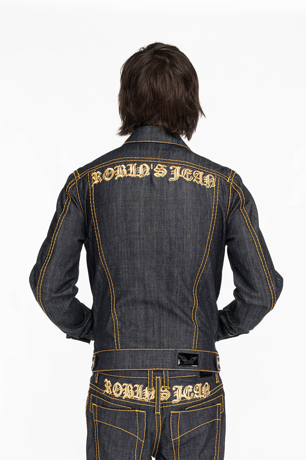 Robin's Raw Denim collection denim jacket. This is an unwashed indigo blue jacket constructed using premium rigid denim for both style and durability. It features a contrast heavy stitching in orange color and embroidered Old English script.