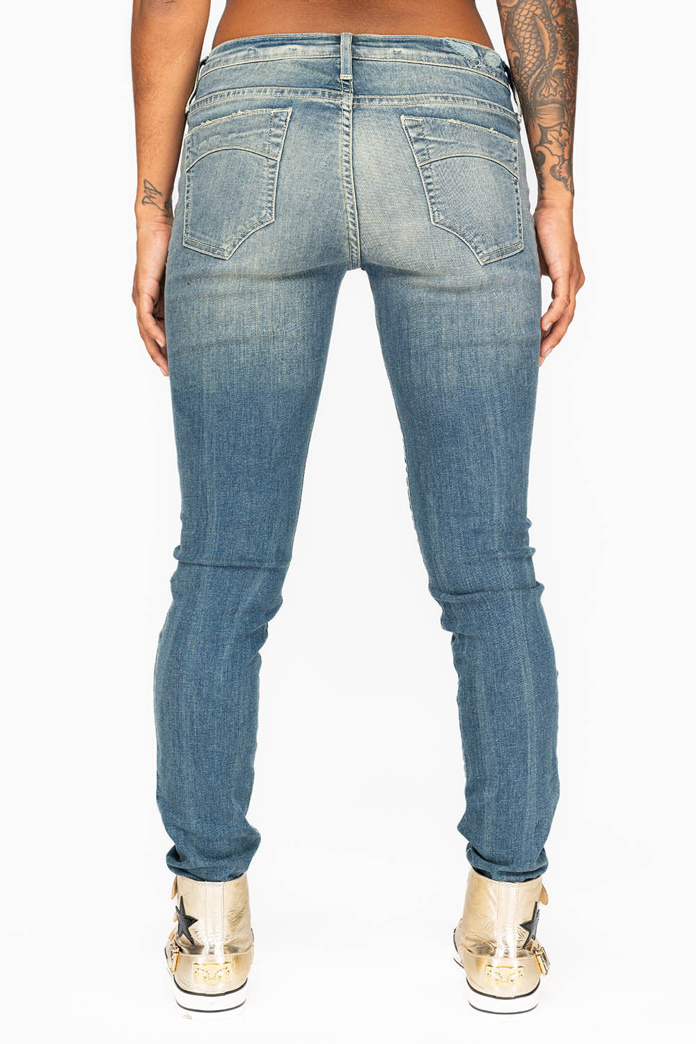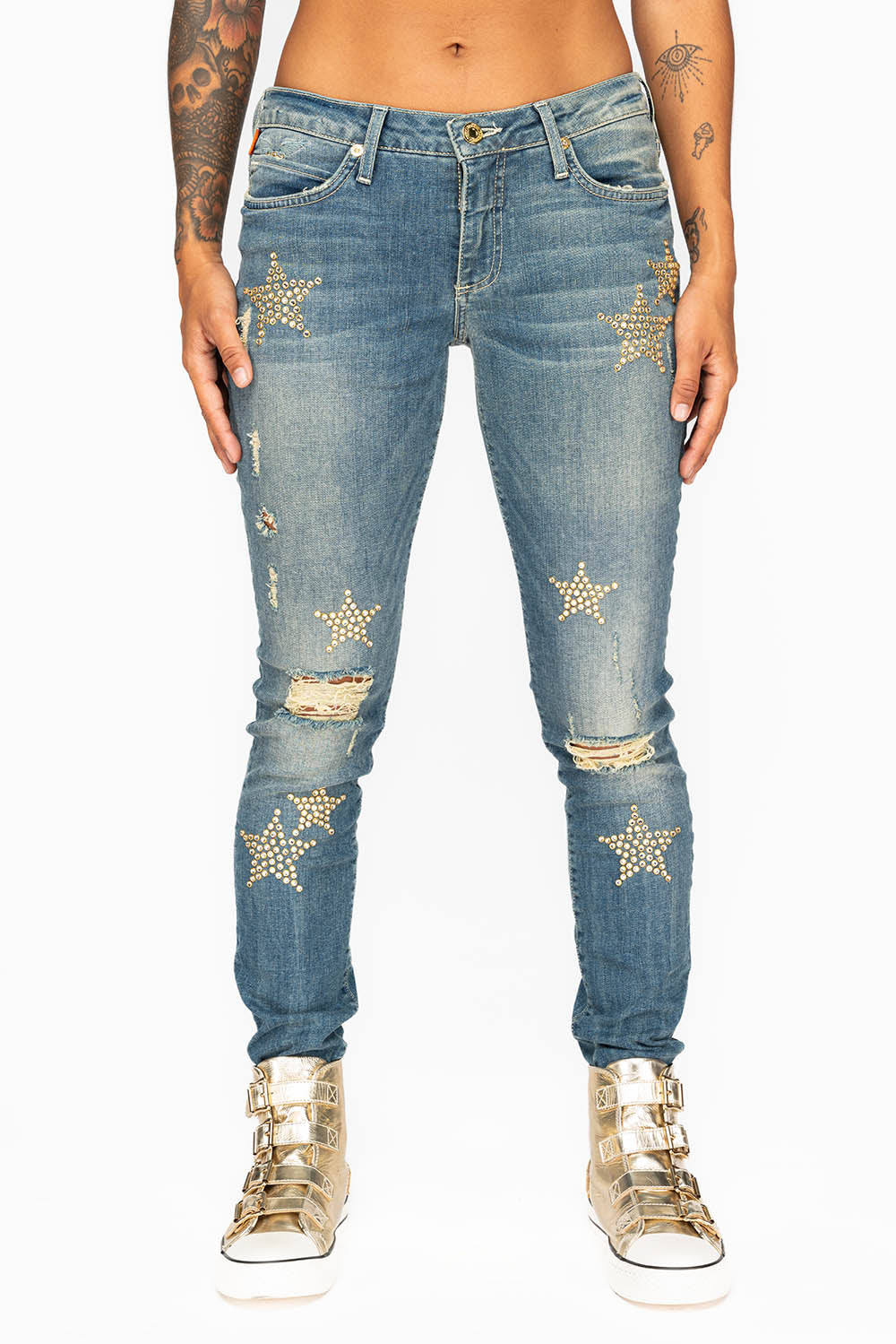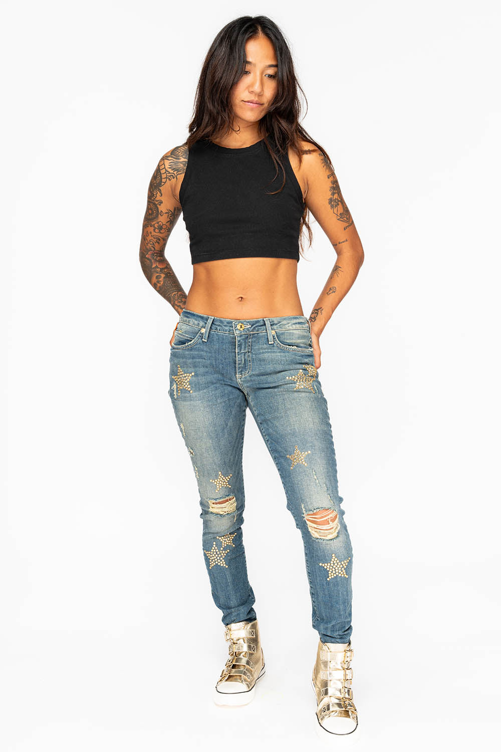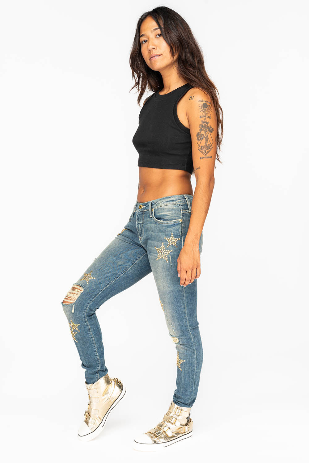 Robin's midrise skinny jeans in Ripped Blue wash with Clear crystal stars and Gold rims. These jeans are constructed using lightweight premium stretch denim for both comfort and style.