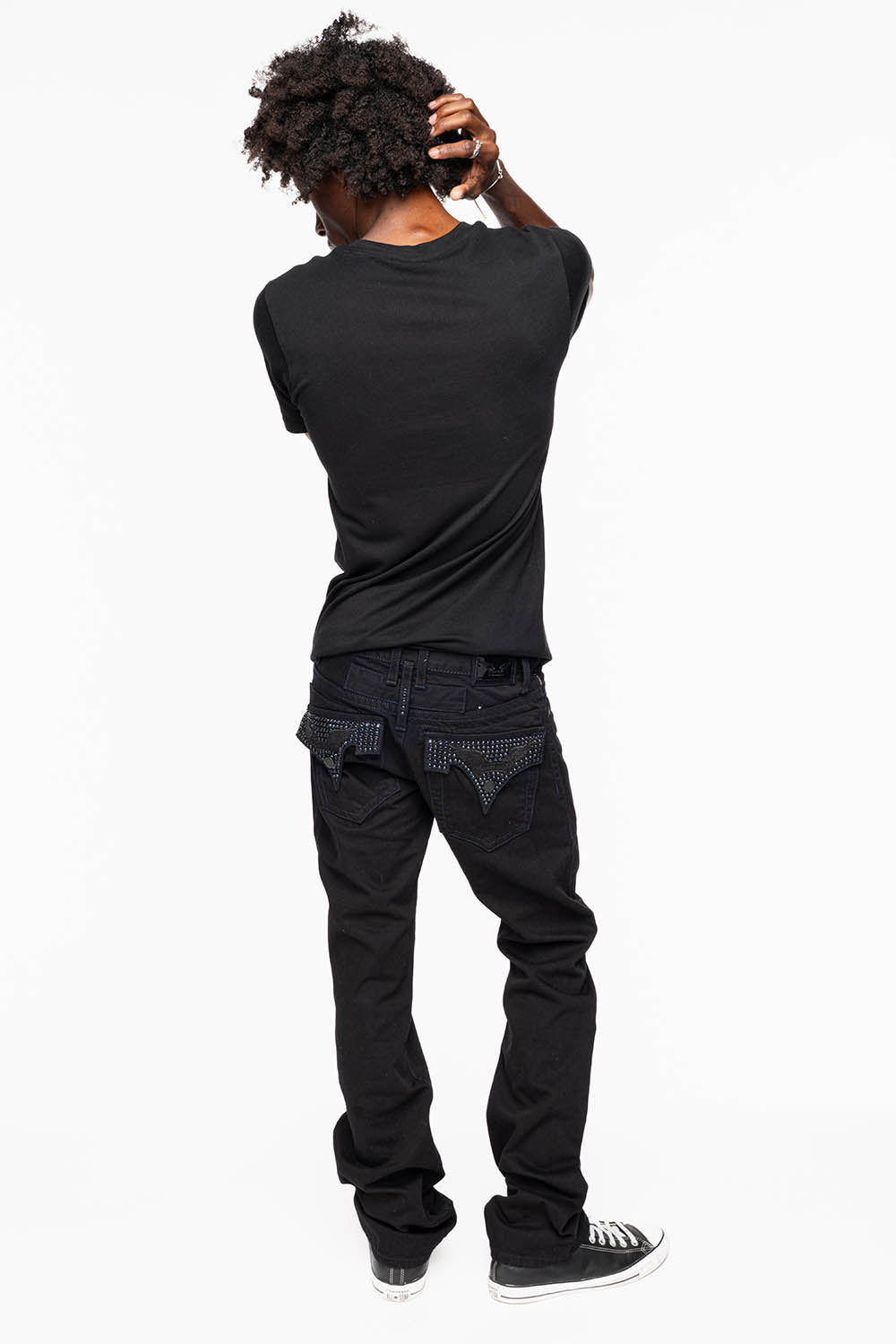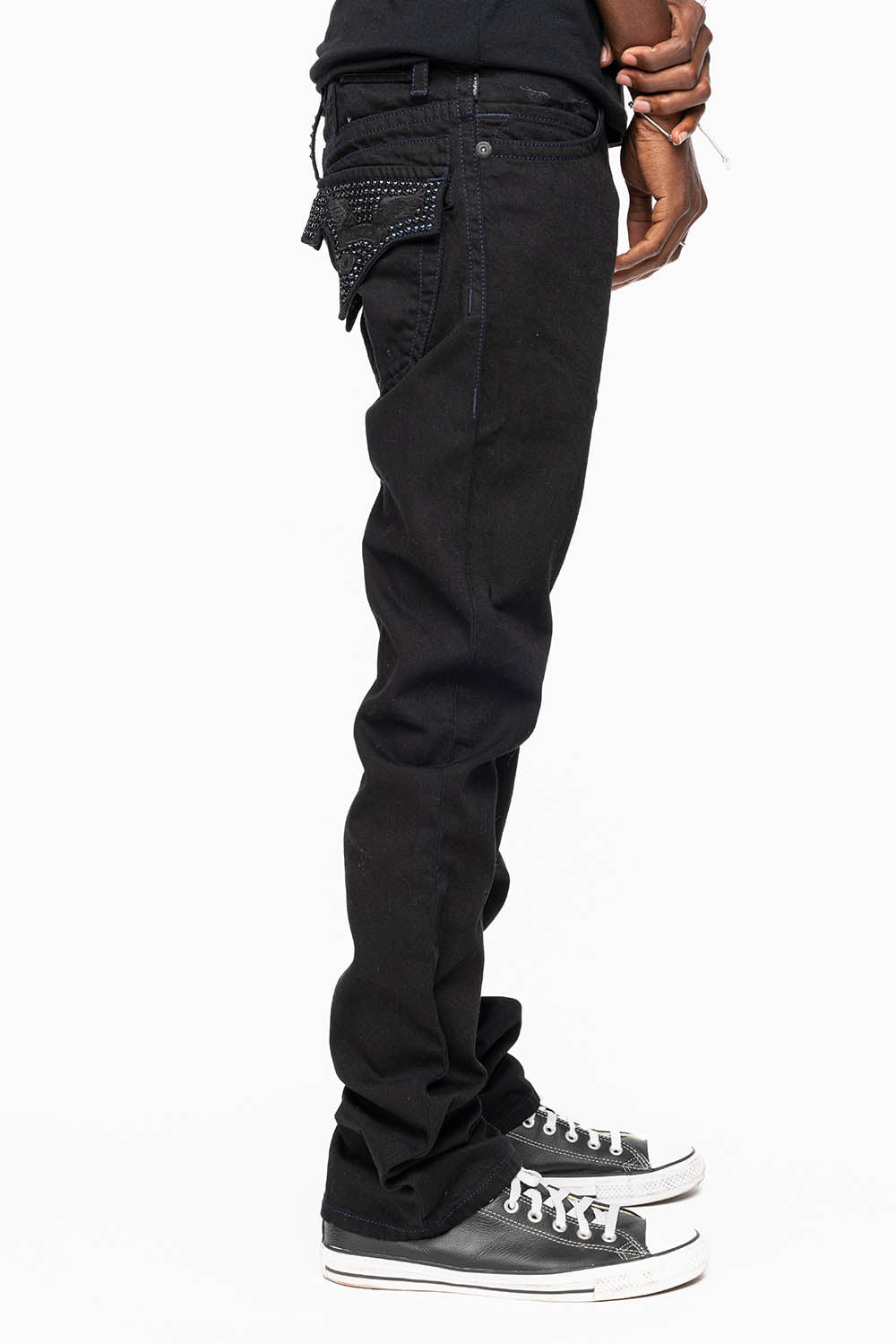 Robin’s R-Flap Jeans in Black wash embellished with Blue Montana Crystals.