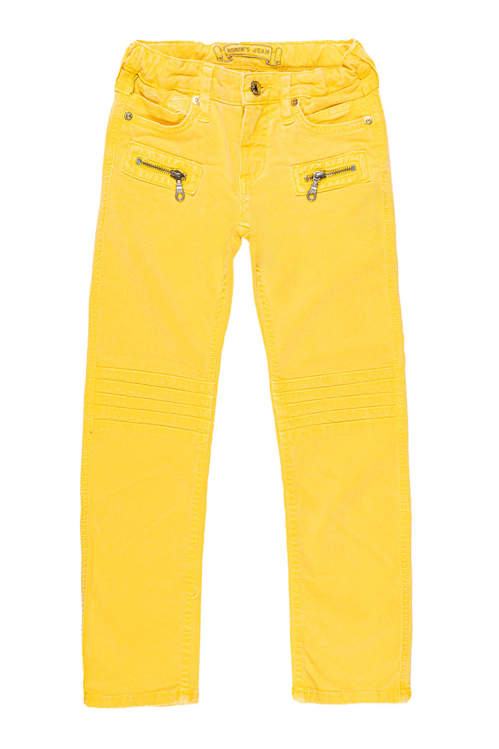 Kids Classic biker style in Yellow wash. This fantastic jean comes in a stretch poplin fabric for comfort and style. It is detailed with biker style quilted knees and zippers. These jeans come in a slim leg fit.