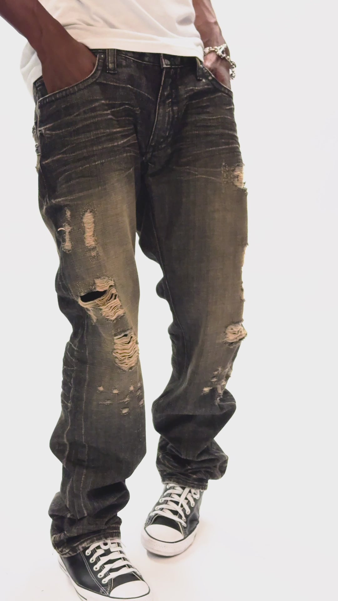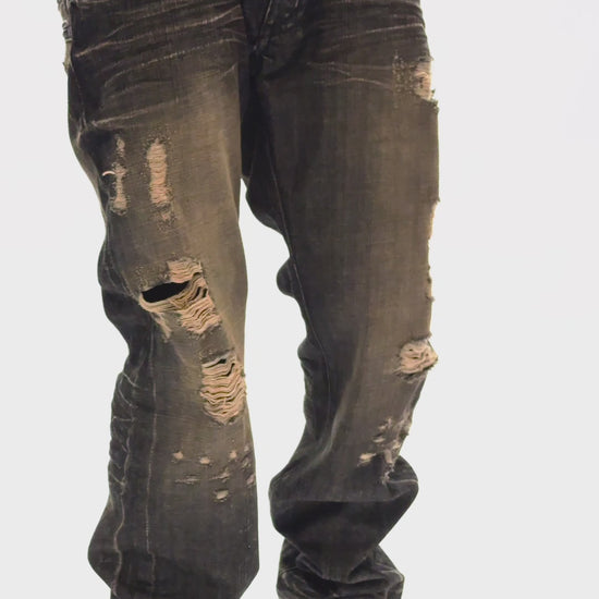 LIMITED EDITION STRAIGHT LEG JEANS IN CHARCOAL MODOC BROKEN WASH WITH CRYSTALS AND NAILHEAD
