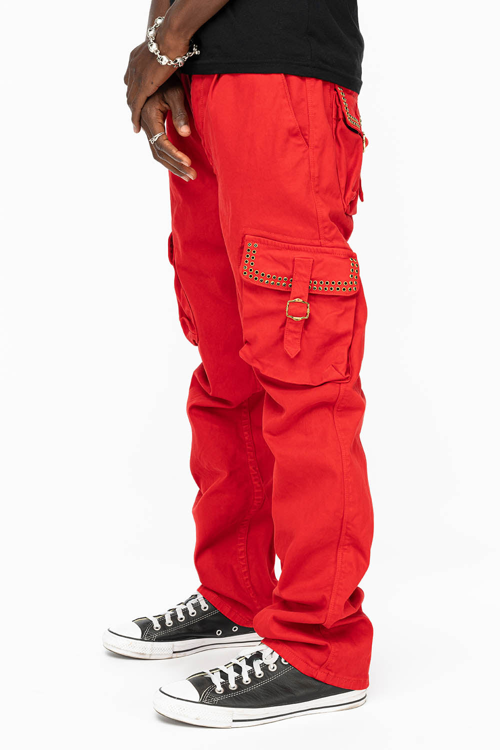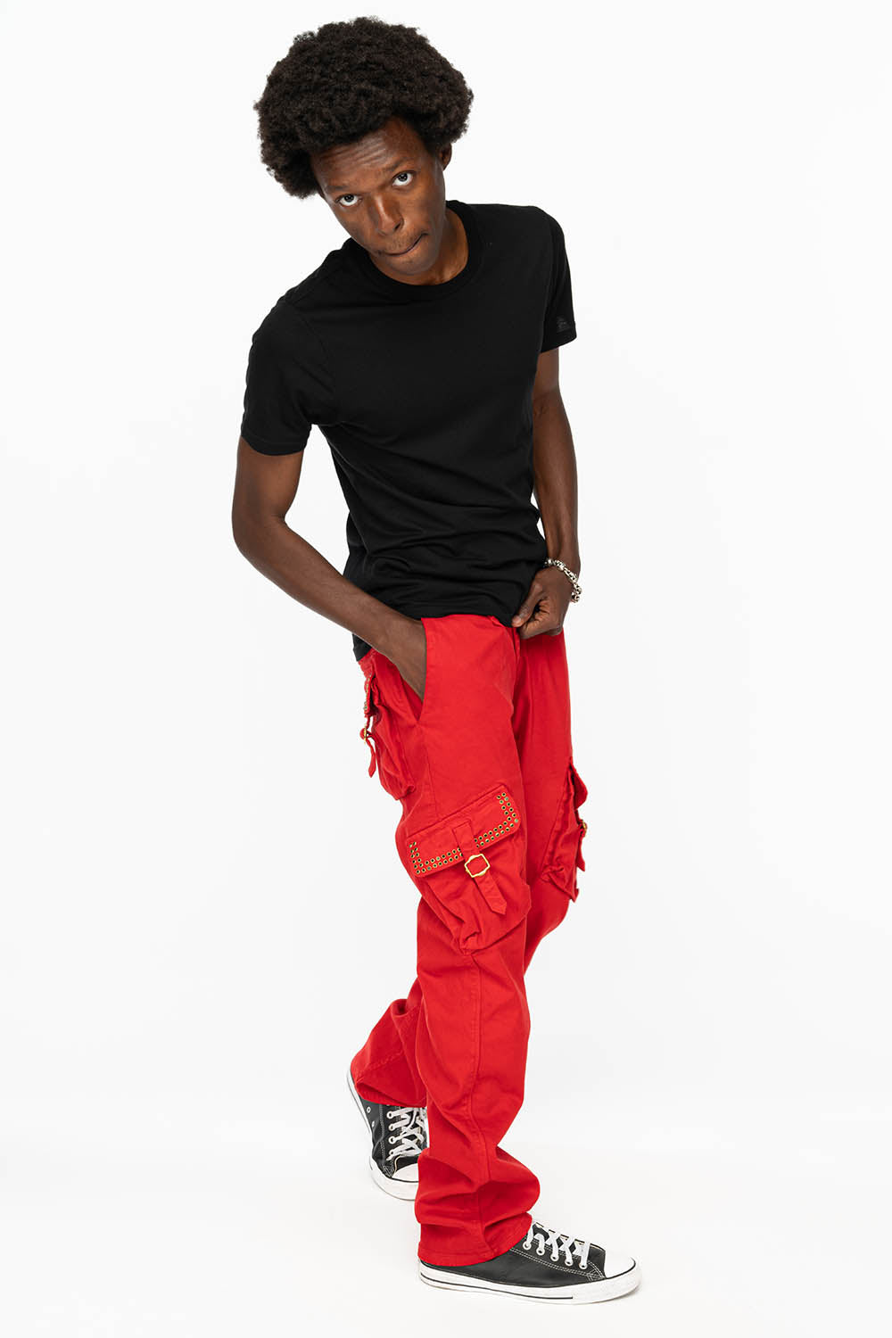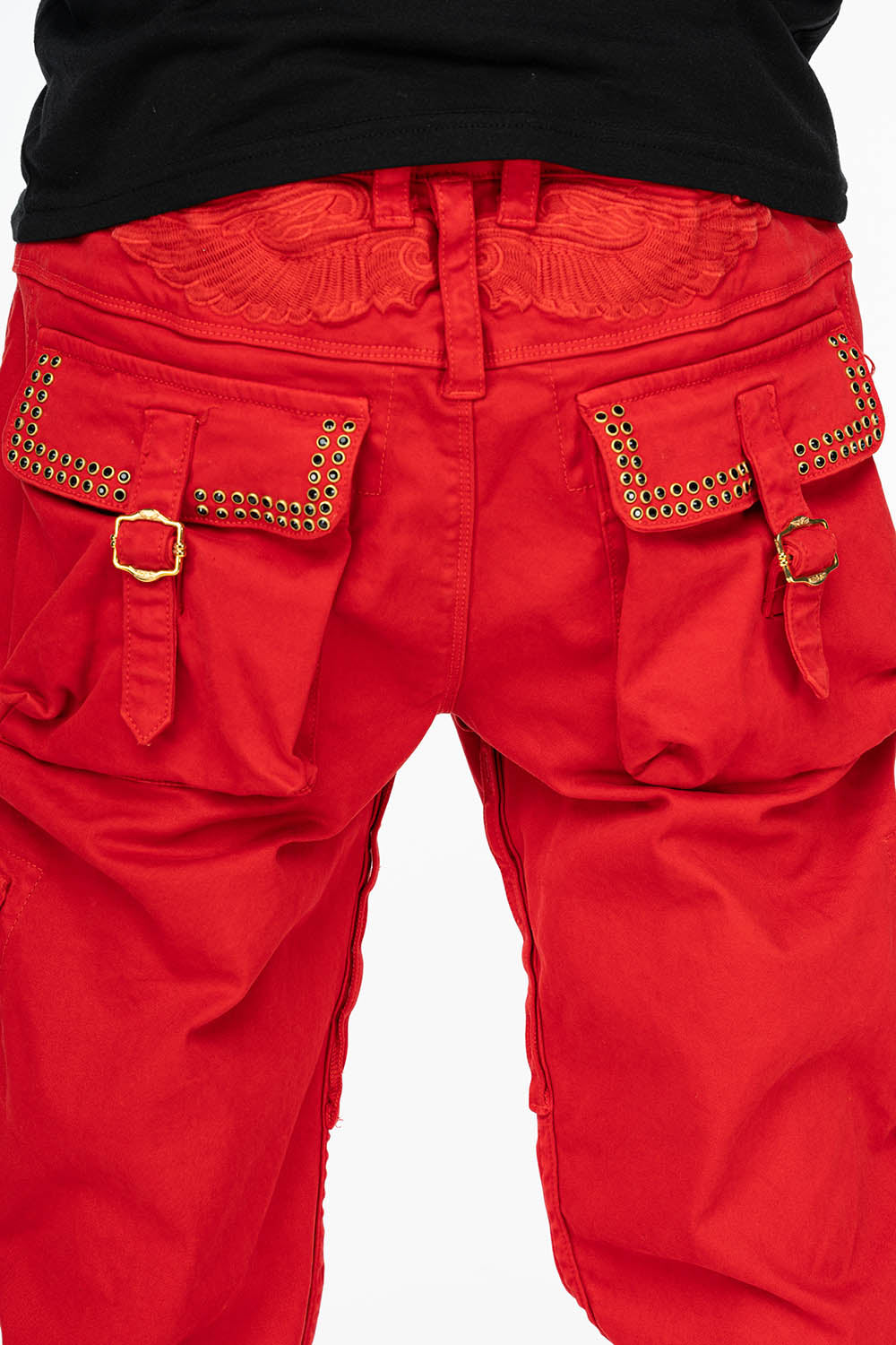 Robin's New Military cargo pants in Red wash. This is a classic fit wide leg cargo pant. These pants come with cargo pockets (front and rear) embellished with Jet Blk Crystals with Gold Rims, and they are constructed using a light weight stretch poplin fabric for both comfort and style.