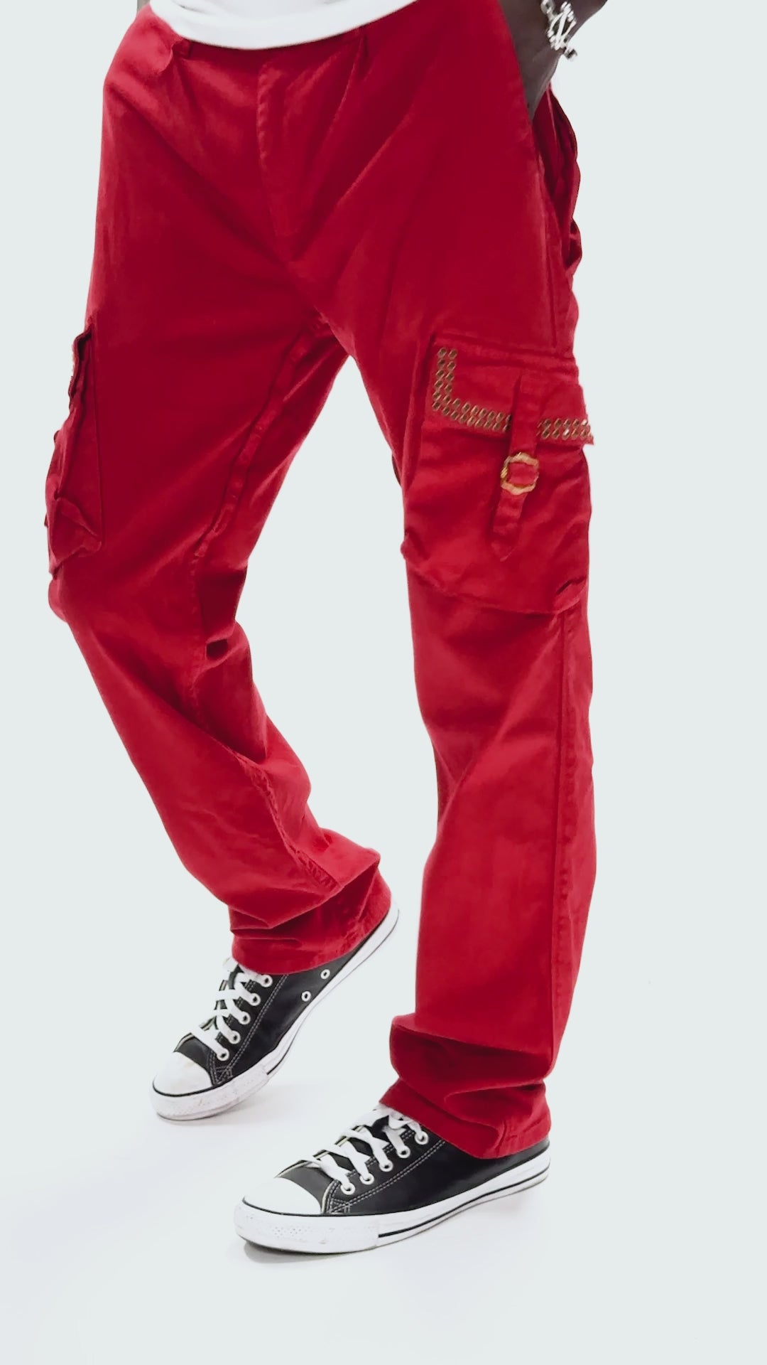 ROBINS NEW MILITARY STYLE CARGO PANTS IN RED WITH JET BLK CRYSTALS