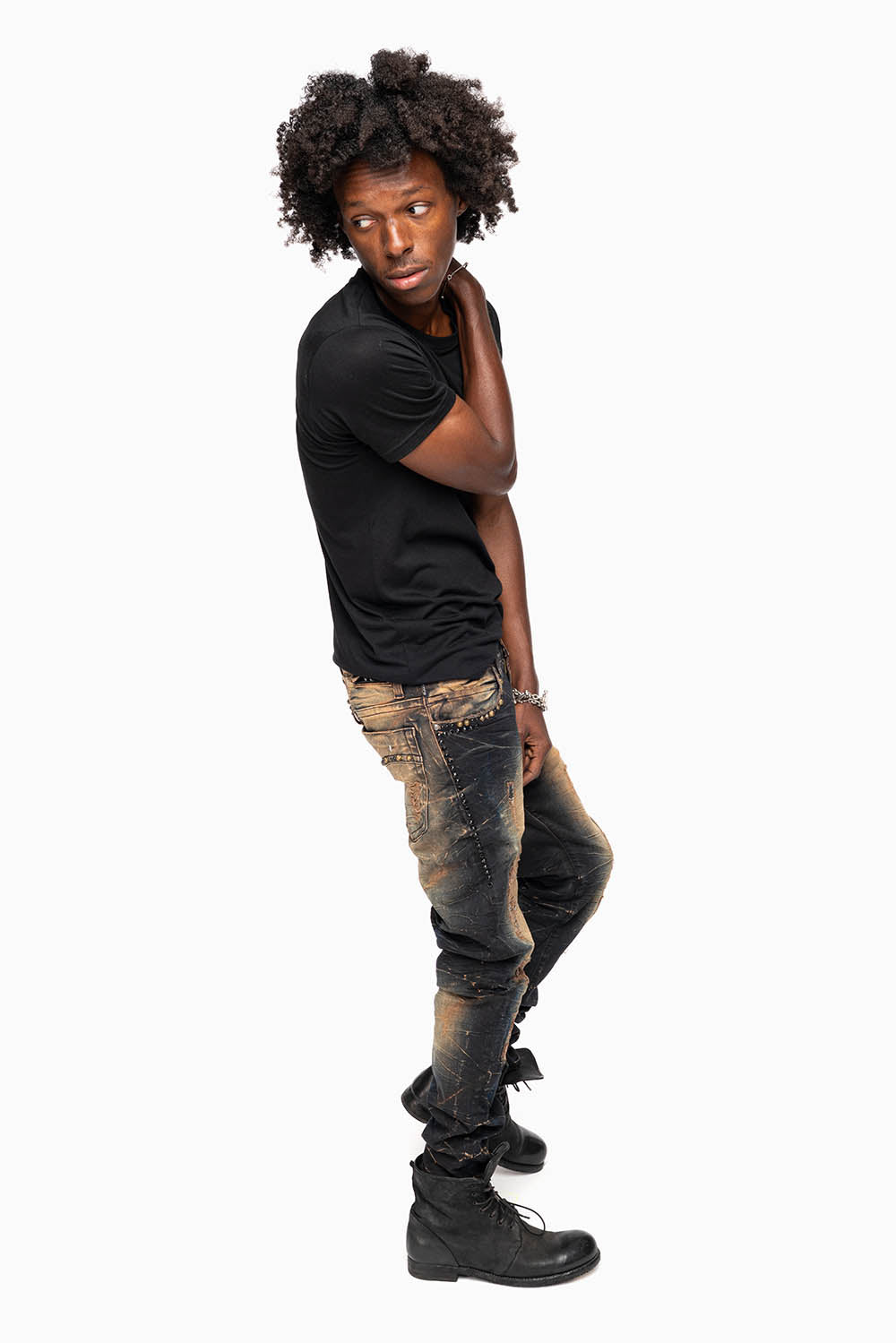 SKINNY MENS JEANS IN 4D DARK OXIDO BROKEN BACKING WASH WITH LARGE CRYSTALS & STUDS