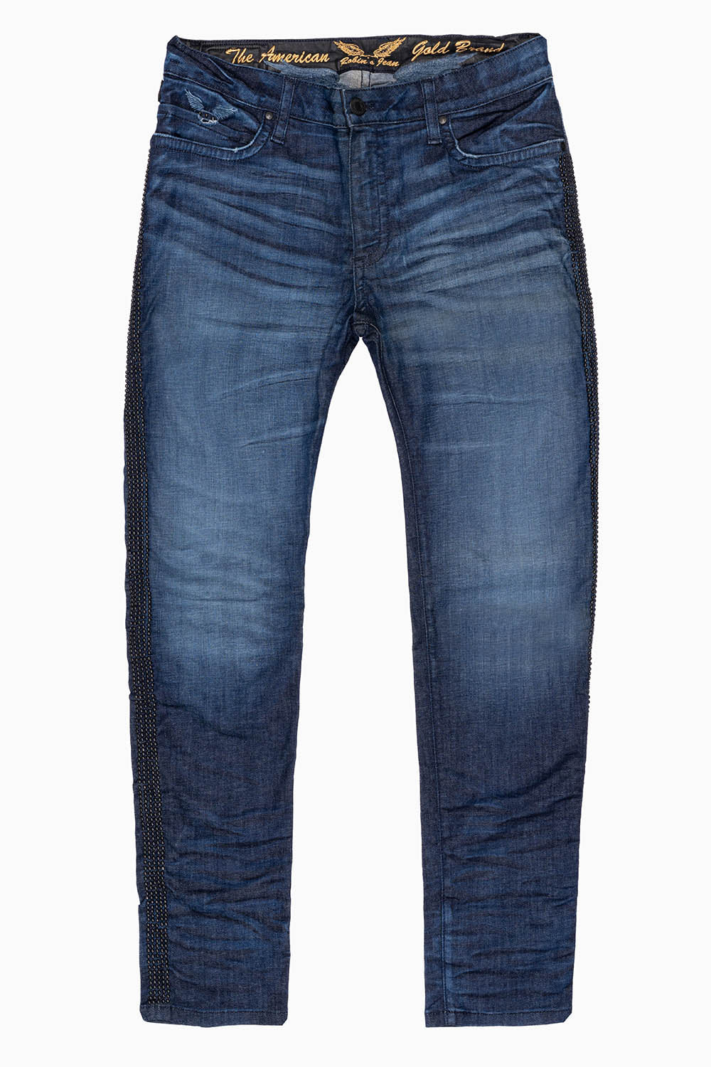 SKINNY MENS JEANS IN BLUE LIBERTY DARK WASH WITH SIDE SEAM STRIPE NAILHEADS